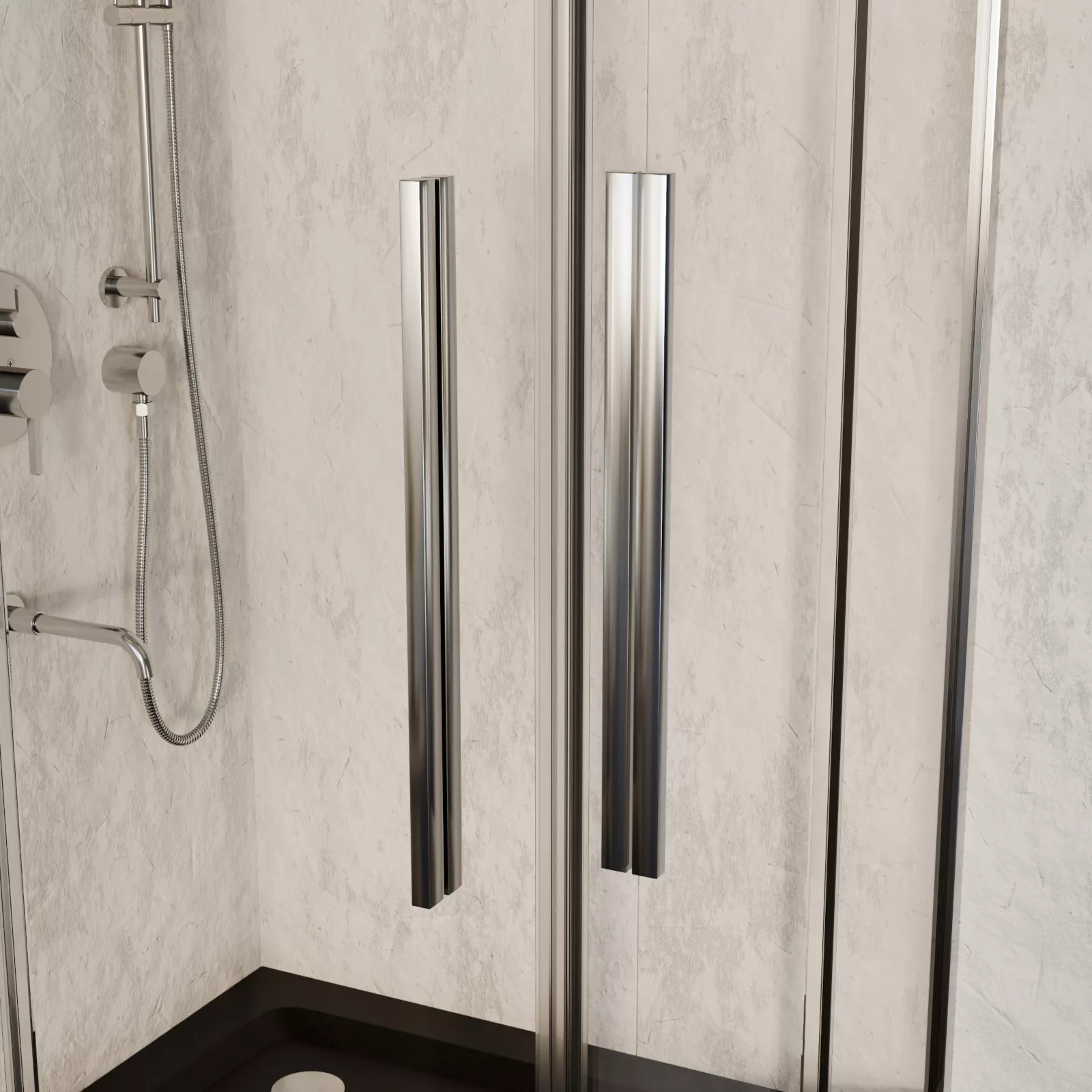 - Felszereltség: Krómozott állítható alumínium profilok, polírozott minimalista fogantyú, vízzáró szilikon profilok, mágneses ajtózár