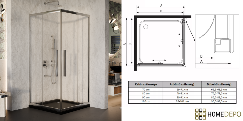 Napjainkban a praktikum mellett a fürdőszoba esztétikus megjelenése is fontos szempont. Az átlátszó üveges zuhanykabinok egyik előnye, hogy nem szűkitik össze a teret, elegáns, légies megjelenést kölcsönöznek a fürdőszobának. Az átlátszó üvegű zuhanykabinok a hagyományos és modern fürdőszobákban is megállják a helyüket. Az tolóajtónál az ajtónyílásból elvesznek az egymásra csúszó részek. Kisebb helyiségekben is kiváló megoldás lehet helytakarékosság szempontjából, mivel így nem kell arra figyeljen, hogy legyen elég hely az ajtó kinyitásához. A szögletes formával a rendelkezésre álló teret maximálisan ki lehet használni. Előnye, hogy zuhanyzáskor kényelmes, az íves formánál jelentősen nagyobb tér áll rendelkezésre. Saját márkás, Homedepo Elio, szögletes zuhanykabinunk, dupla görgőkkel érhető el, aminek köszönhetően jobban eloszlik a terhelés, egy ajtó 2 pont helyett 4 ponton gördül. Ez nagy mértékben biztosítja az egyenletesebb, simább működést és a hosszabb élettartamot. A görgők további fontos tulajdonságai közé sorolható, hogy Quick release systemmel ellátottak, aminek segítségével könnyedén fel- és leszerelhető a könnyedebb tisztítás érdekében.