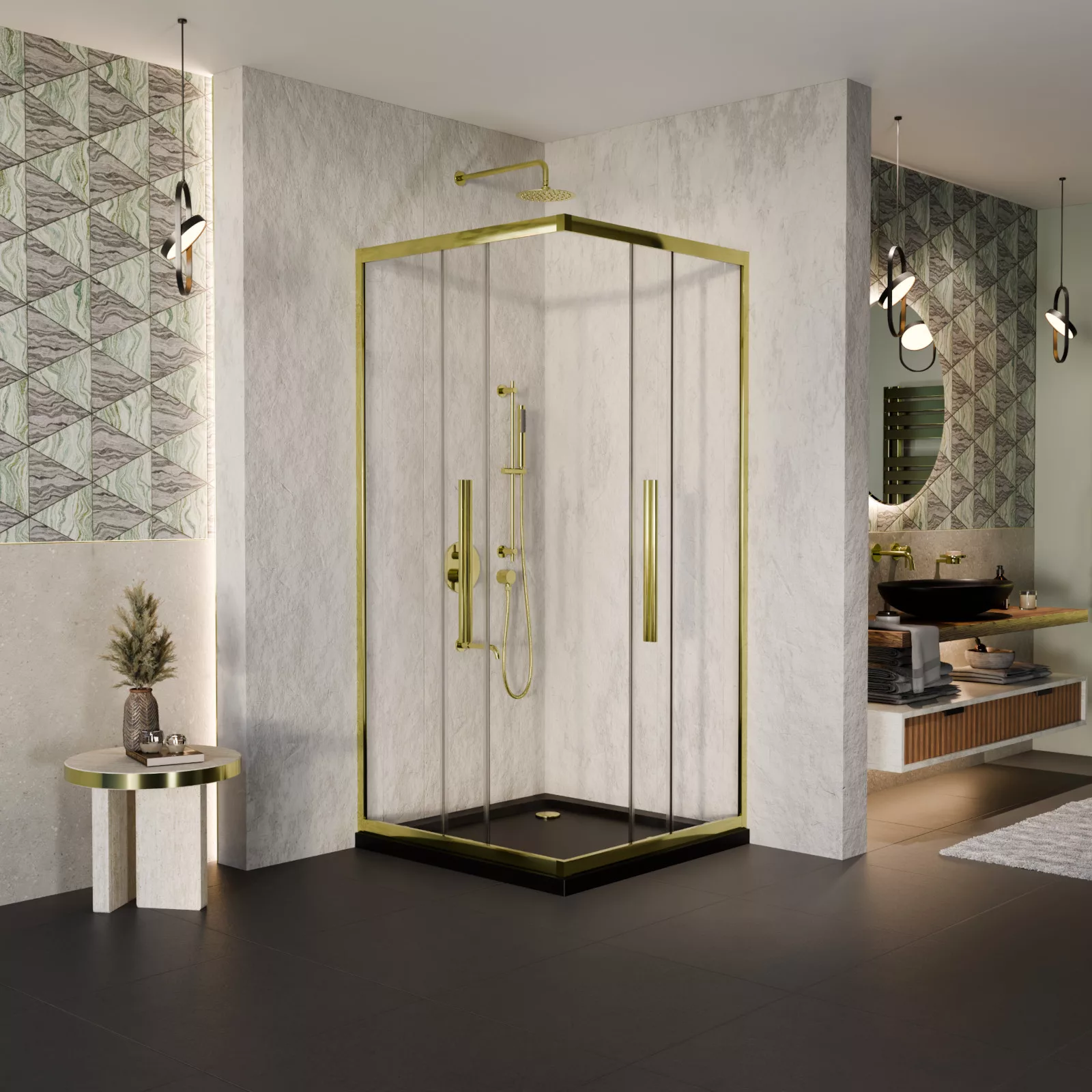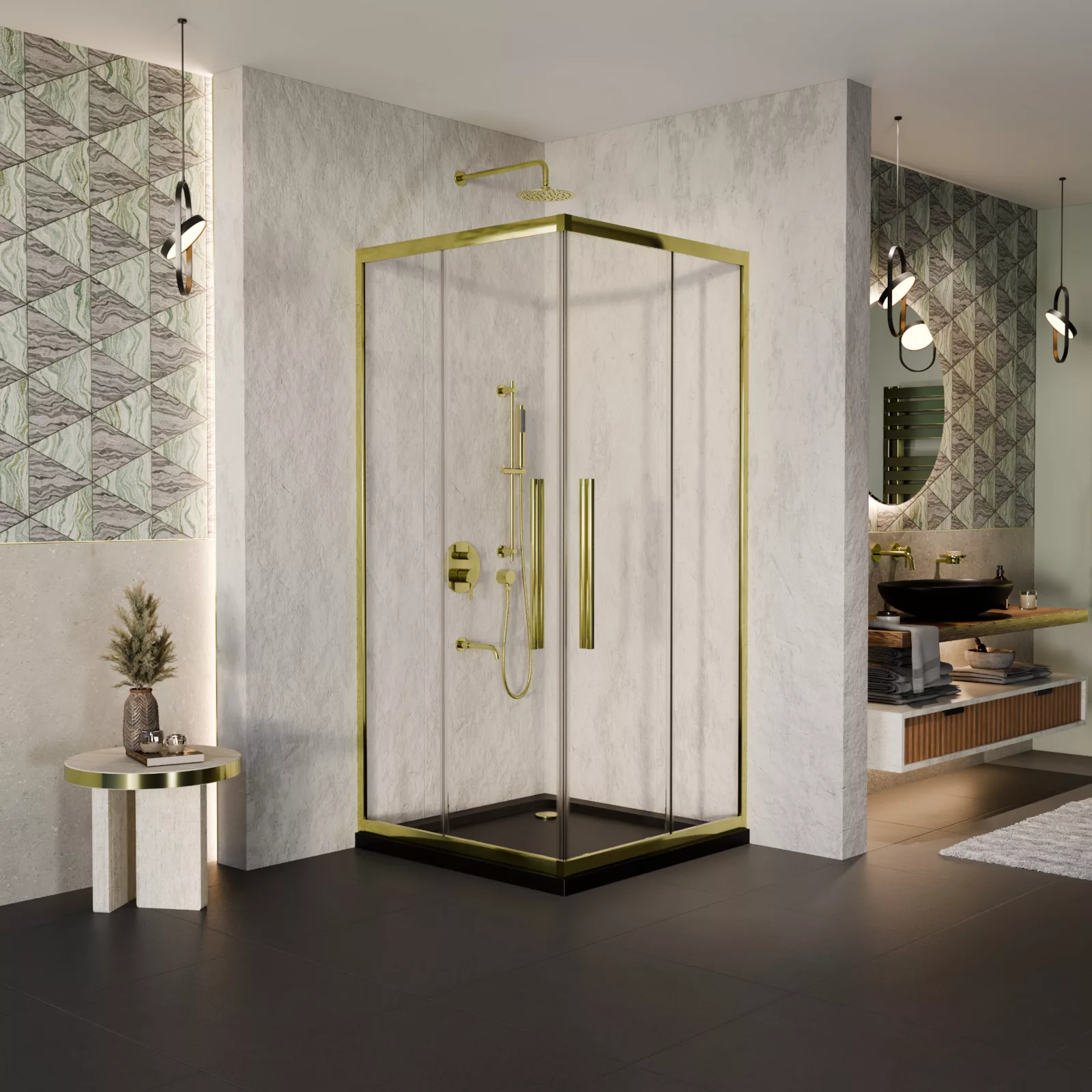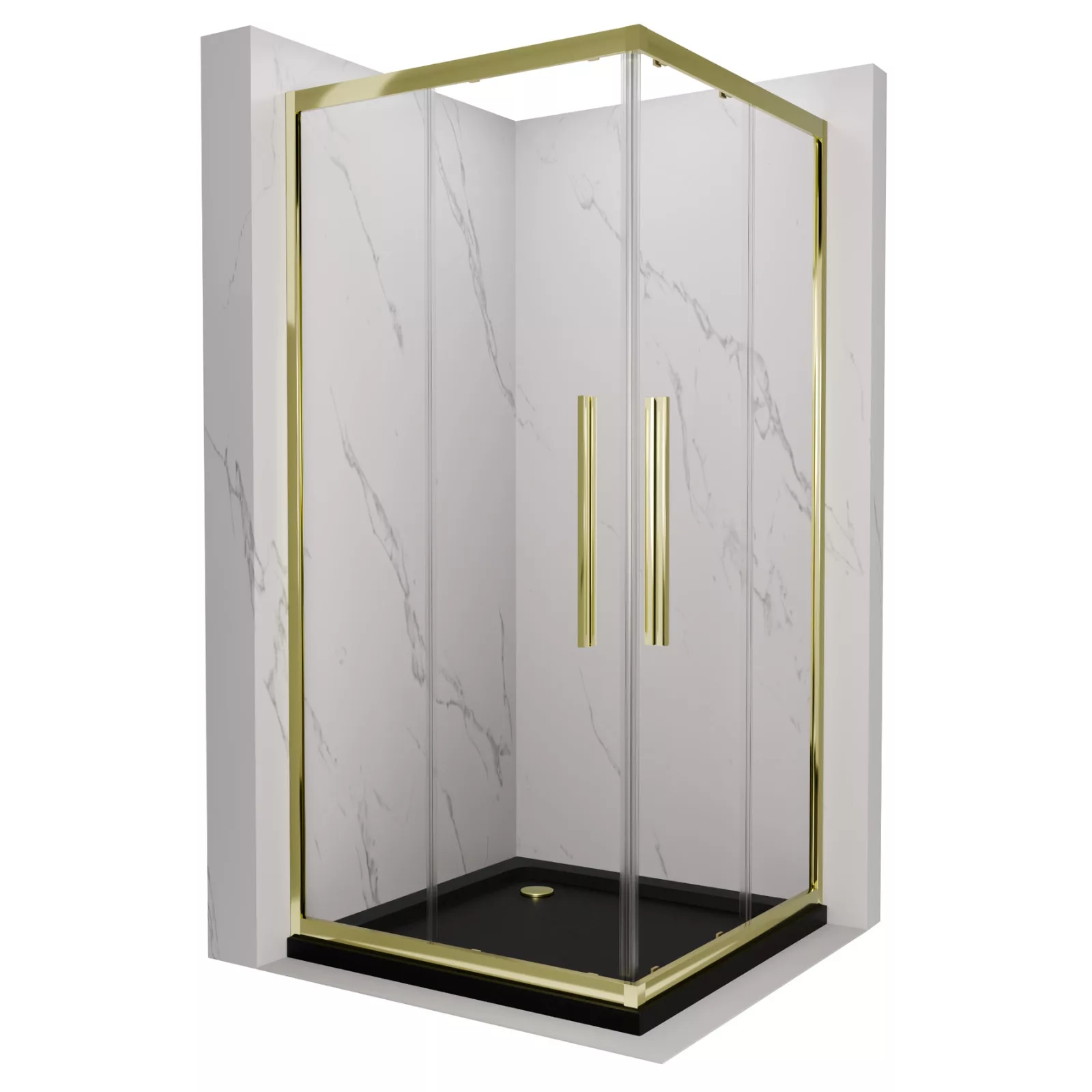 HD Elio+ Gold 80x80 szögletes két tolóajtós zuhanykabin fekete slim zuhanytálcával és arany szifonnal