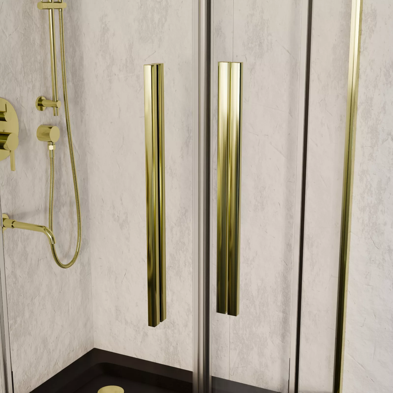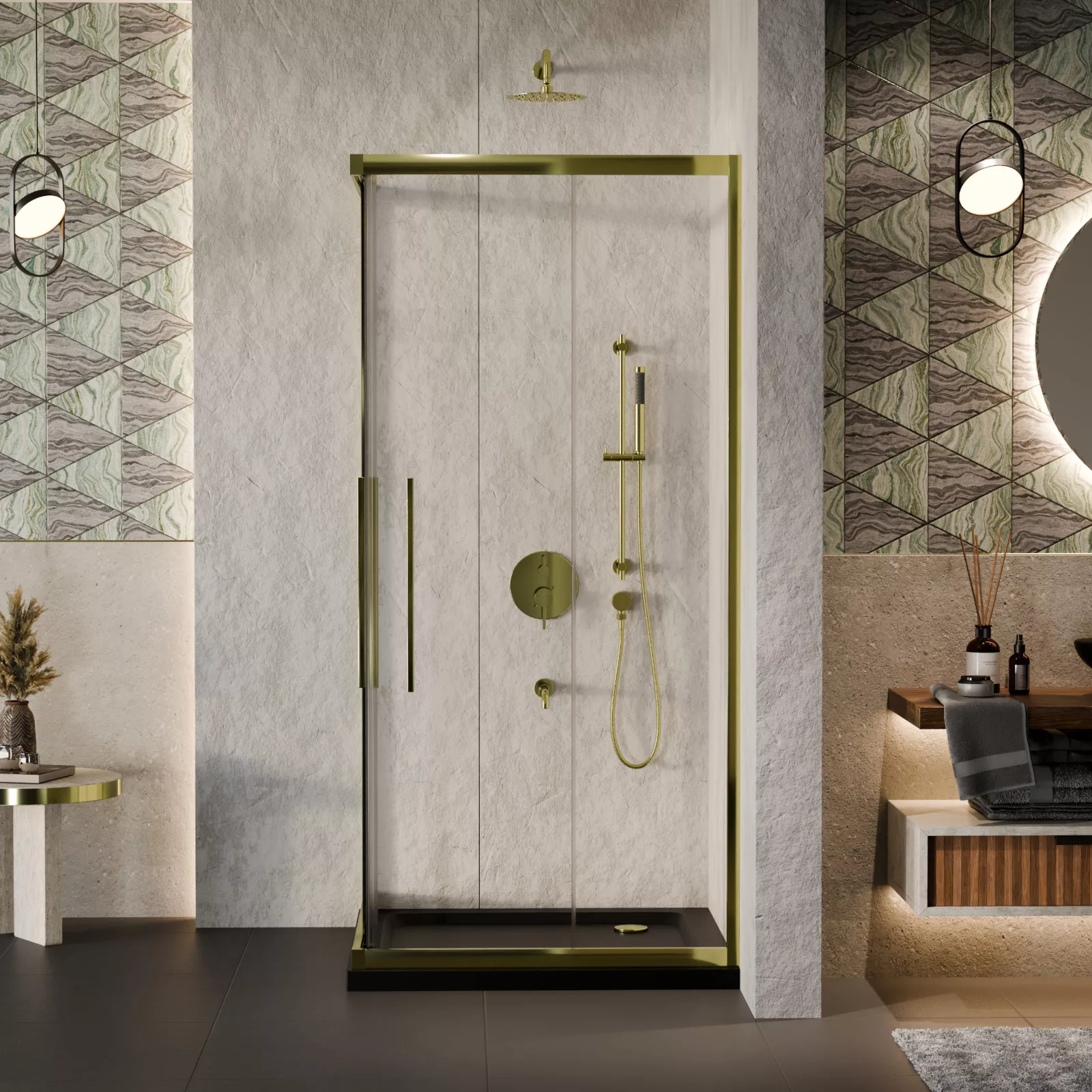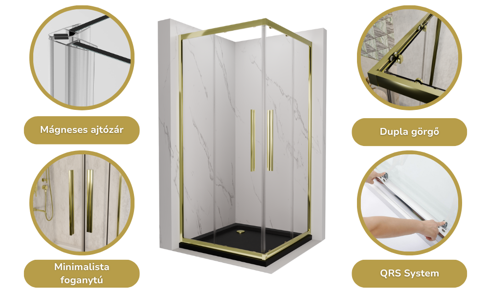 HD Elio+ Gold 80x80 szögletes két tolóajtós zuhanykabin fekete slim zuhanytálcával és arany szifonnal