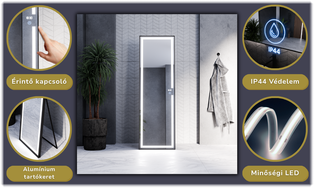 További előny, hogy a modern álló tükrök LED világítással is elérhetők, melynek fényereje és színhőmérséklete állítható, így tökéletes fényt biztosít. A tartós kialakítás és minőségi anyaghasználat hosszú élettartamot garantál, így hosszú éveken át szolgálhatja a mindennapokat. Az álló tükör ráadásul elegáns kiegészítőként is működik, amely harmonikusan egészíti ki a fürdőszobai bútorokat, és egy letisztult, esztétikus enteriőrt hoz létre.