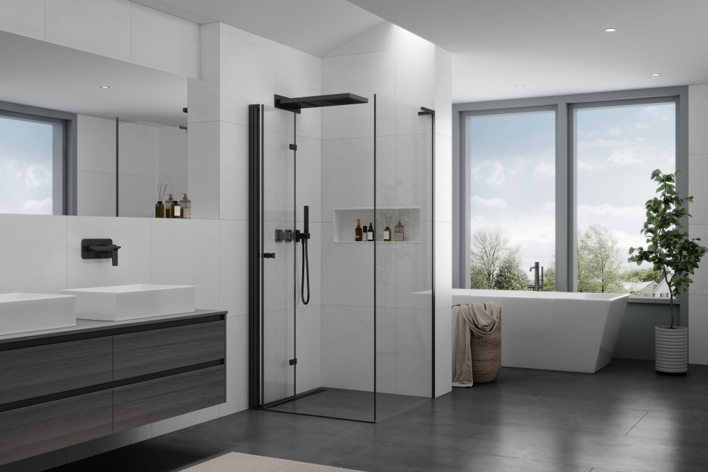 - Felhasznált anyagok: Matt fekete rozsdamentes acél, matt fekete alumínium, biztonsági üveg, vízzáró szilikon profilok, alumínium küszöb, mágneses ajtózár