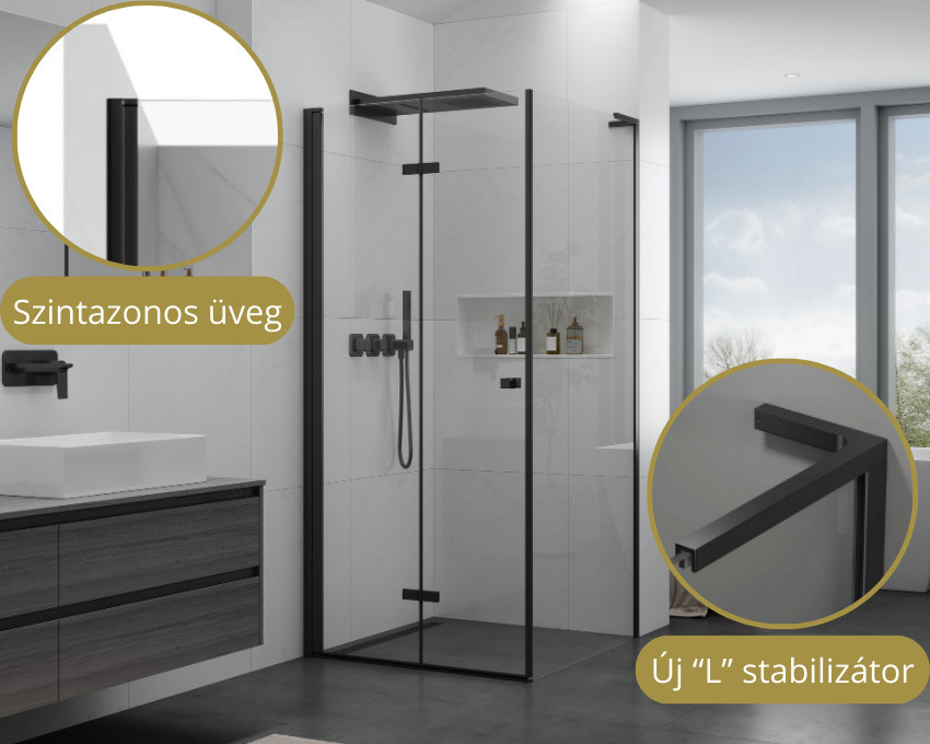 A zuhanykabin 6 mm vastag biztonsági üvegből készül, amelyet két oldalról fognak össze az alumínium profilok, továbbá a biztonság és a modern megjelenés érdekében újgenerációs "L" stabilizátorral láttuk el a zuhanykabint. A zsanérok által biztosított összecsukhatós rendszernek köszönhetően nincs görgő, csak az egyszerű, elpusztíthatatlan ajtónyitó rendszer, amely semmilyen karbantartást nem igényel hosszú távon. Mindemellett zuhanyajtónk univerzális szerelési irányú, így szabadon dönthető el, hogy melyik oldalról kerüljön beszerelésre. További jellemzője, hogy az ajtót színazonos küszöbbel láttuk el annak érdekében, hogy ne legyen esélye a víznek kifolyni, illetve az ajtóra felhelyezhető mágneses csík is felhelyezhető, ami egyszerűbbé varázsolja a mindennapos használatot.