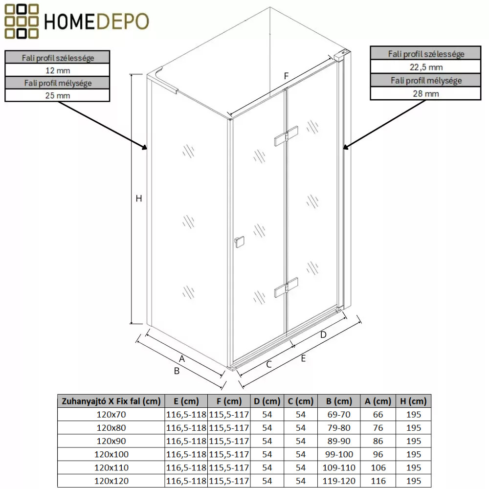 - Fali profil mélysége: Fix üvegnél: 25 mm; Zuhanyajtónál: 28 mm