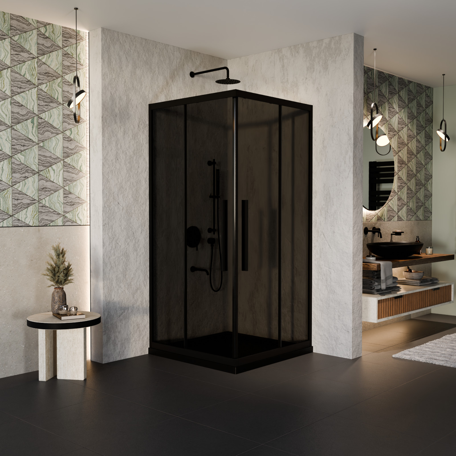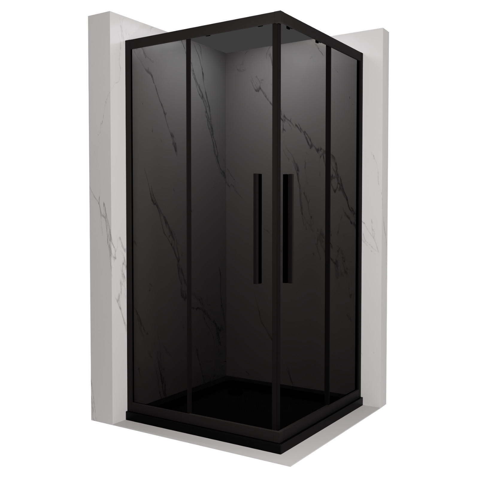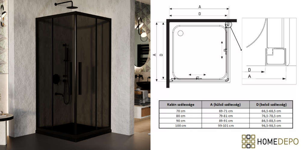 HD Fusion+ 80x80 szögletes két tolóajtós zuhanykabin fekete slim zuhanytálcával és fekete szifonnal