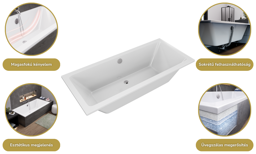 A fürdőkádjaink sokrétű módon felhasználhatóak: burkolható, lábra szerelhető, valamint padlóba süllyeszthető. A fürdőkádhoz tartozó elő és/vagy oldallap könnyedén felhelyezhető.
