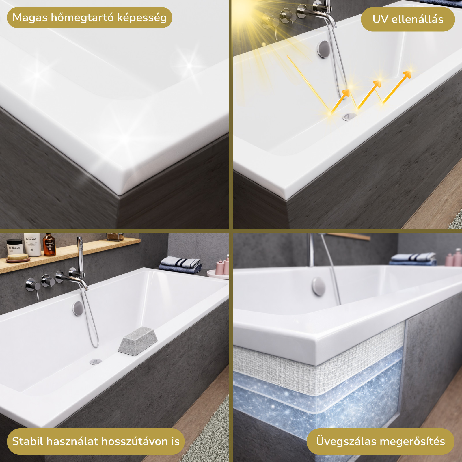 A fürdőkád ellenáll az UV sugárzásnak (nap, fénycsövek, LED izzók) és nem bocsát ki kémiai vegyületeket, ami bőrbaráttá teszi és biztosítja, hogy nem fakul ki a hosszú évek során.