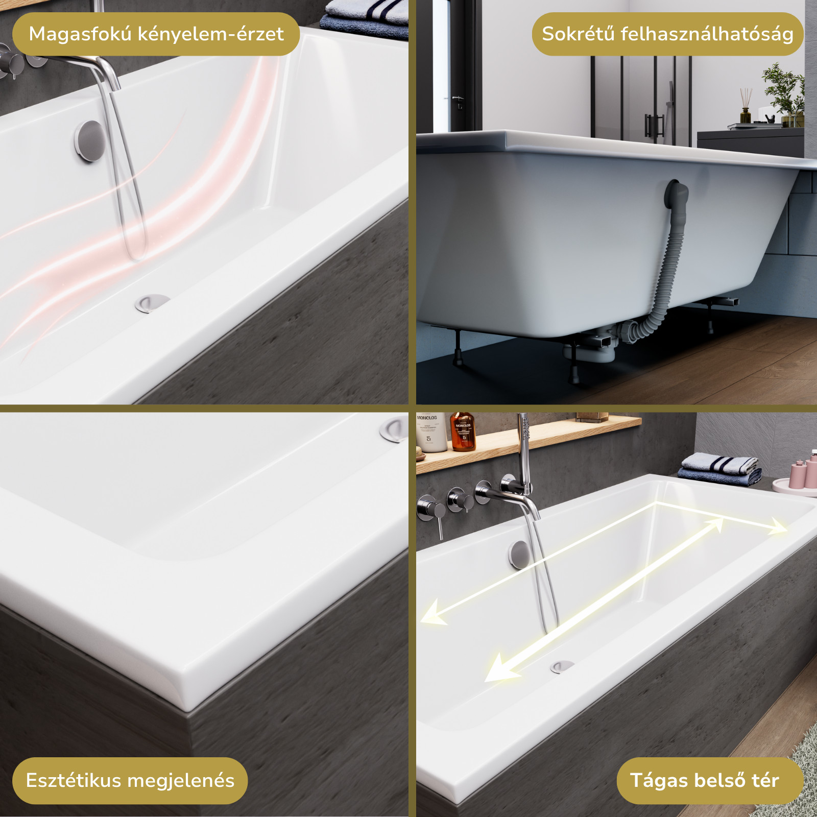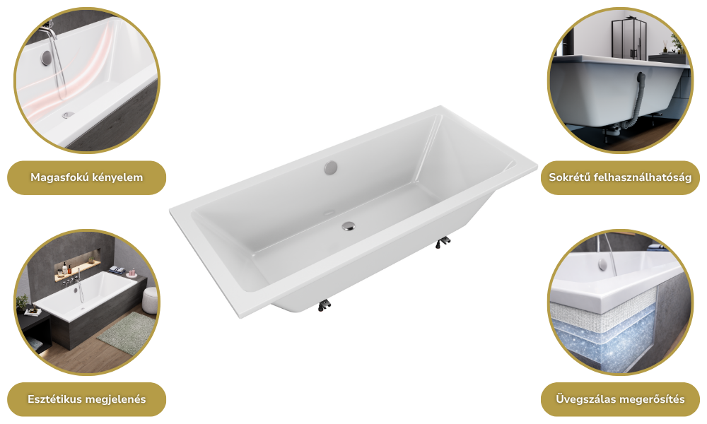 A fürdőkádjaink sokrétű módon felhasználhatóak: burkolható, lábra szerelhető, valamint padlóba süllyeszthető. A fürdőkádhoz tartozó elő és/vagy oldallap könnyedén felhelyezhető.