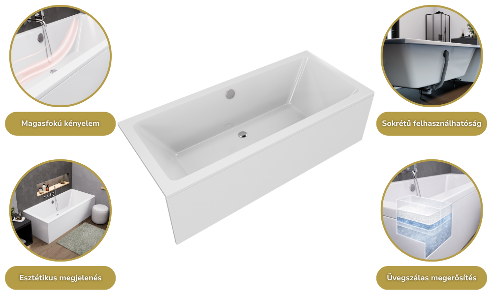 A fürdőkádjaink sokrétű módon felhasználhatóak: burkolható, lábra szerelhető, valamint padlóba süllyeszthető. A fürdőkádhoz tartozó elő és/vagy oldallap könnyedén felhelyezhető.