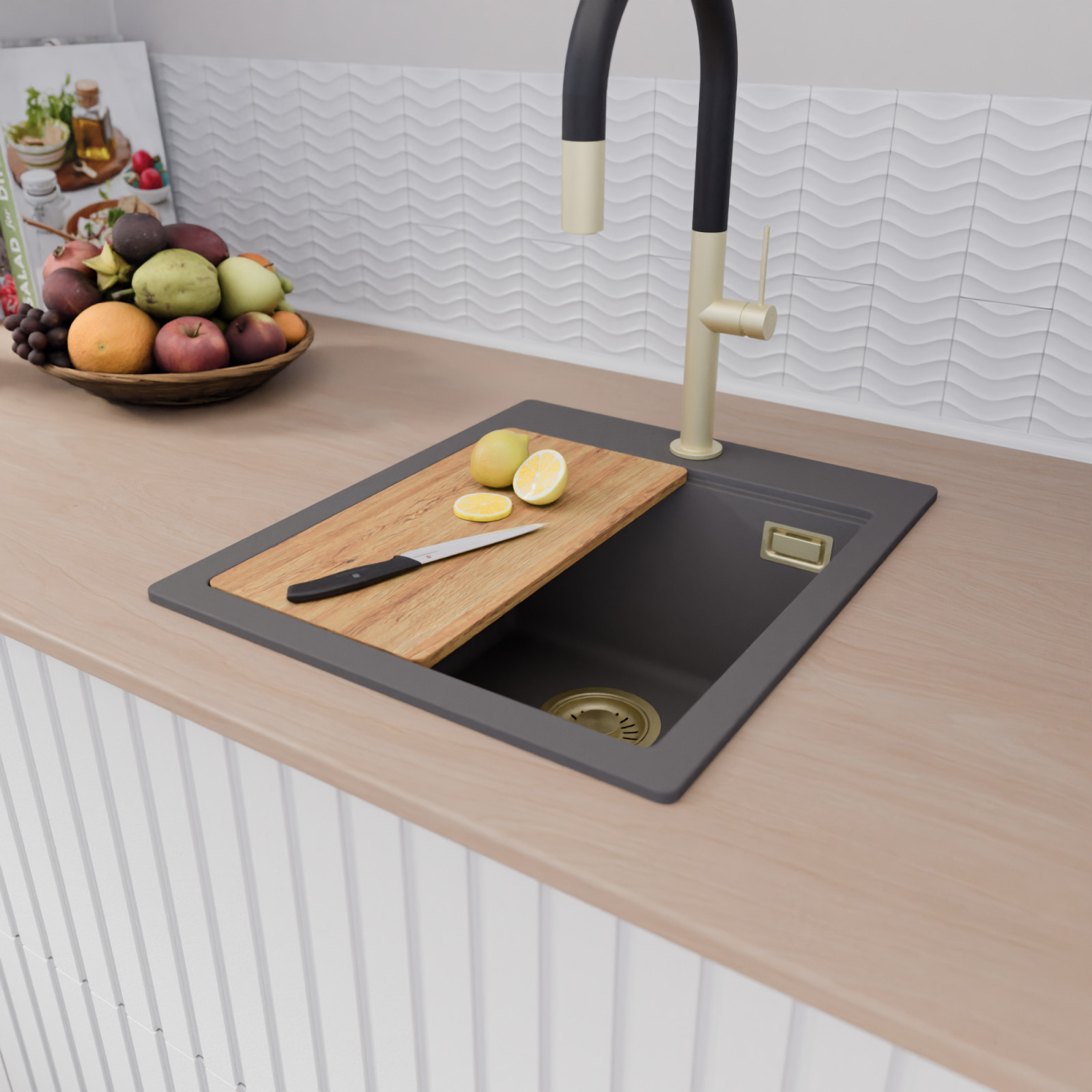 A mosogató prémium minőségű gránit kompozitból készült. Letisztult megjelenése mellett rendkívül praktikus, így bármilyen stílusú konyhába harmonikusan illeszkedik. A strapabíró gránit anyag hosszú távon is megbízható használatot garantál.