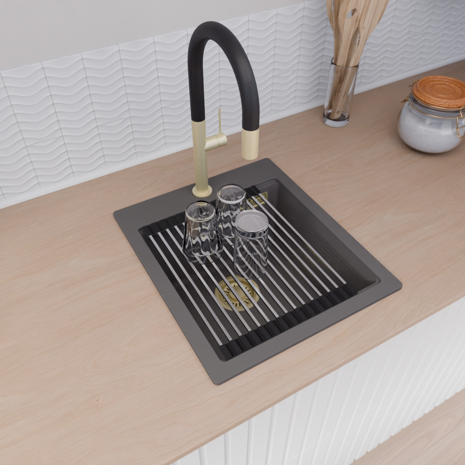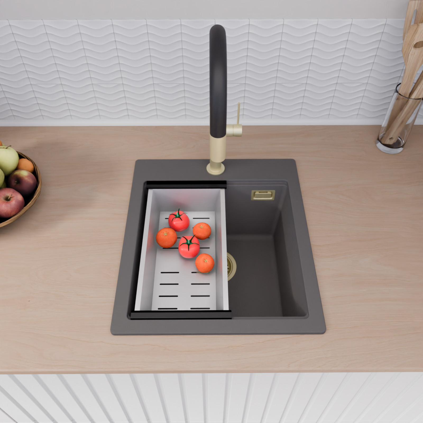 A mosogató prémium minőségű gránit kompozitból készült. Letisztult megjelenése mellett rendkívül praktikus, így bármilyen stílusú konyhába harmonikusan illeszkedik. A strapabíró gránit anyag hosszú távon is megbízható használatot garantál.