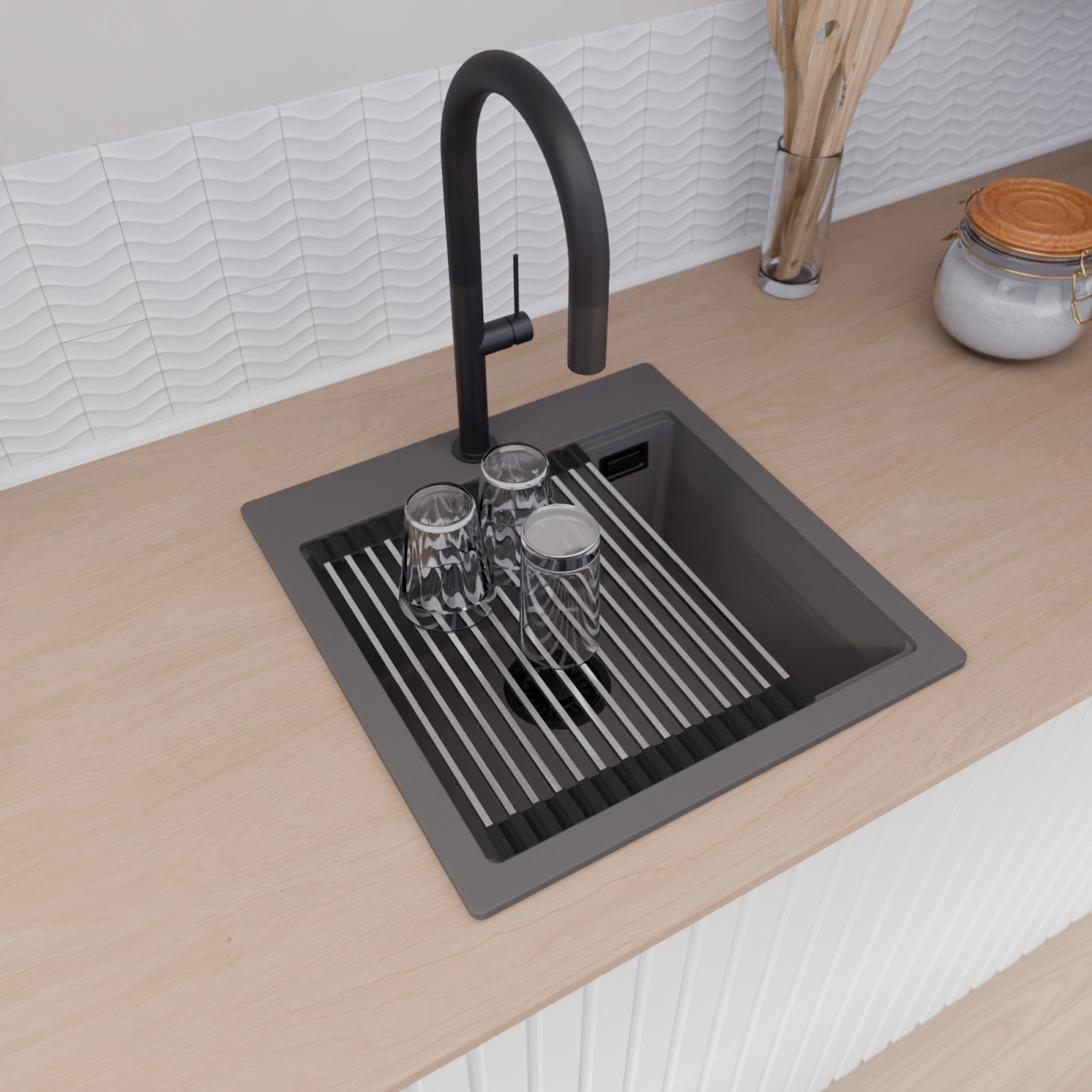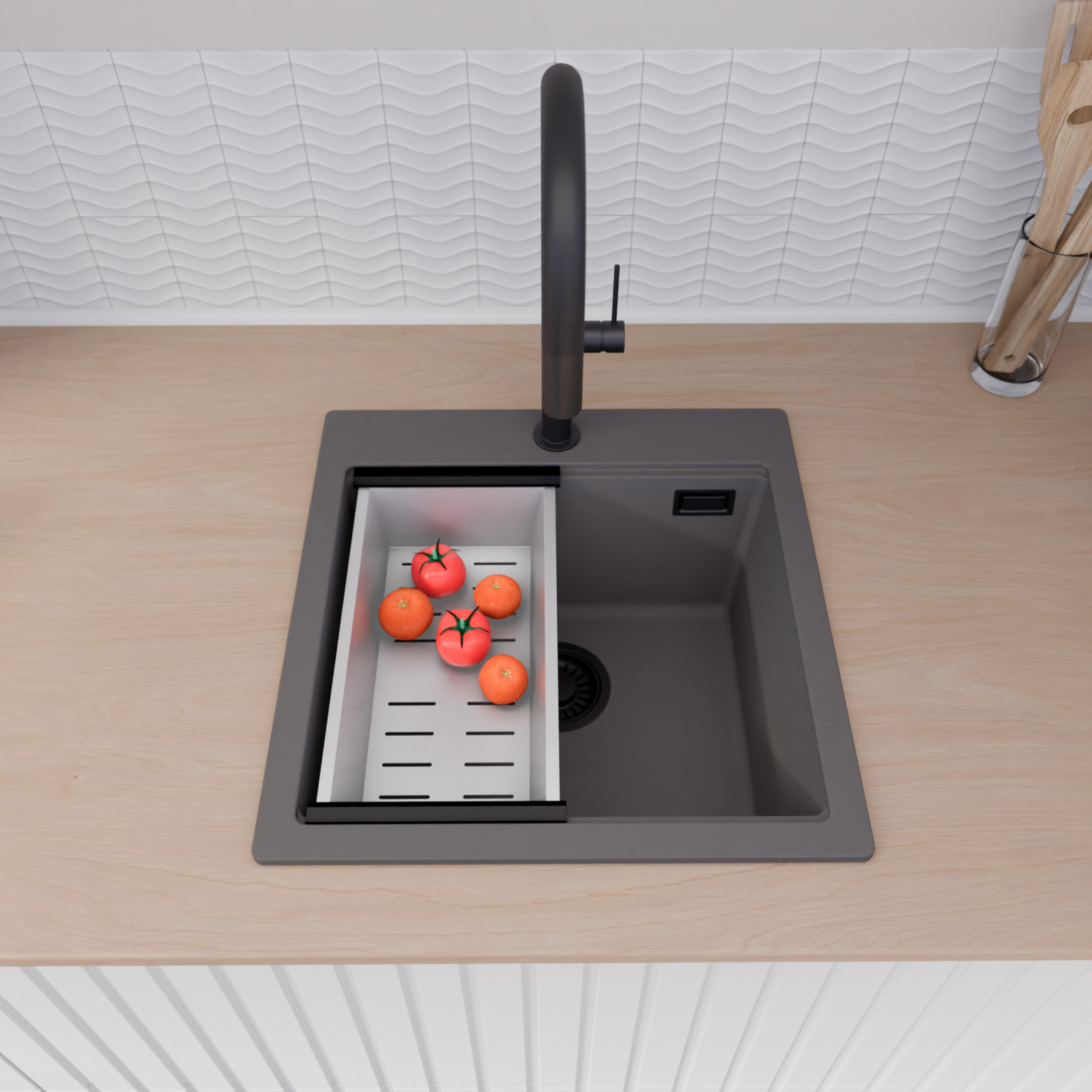 A mosogató prémium minőségű gránit kompozitból készült. Letisztult megjelenése mellett rendkívül praktikus, így bármilyen stílusú konyhába harmonikusan illeszkedik. A strapabíró gránit anyag hosszú távon is megbízható használatot garantál.