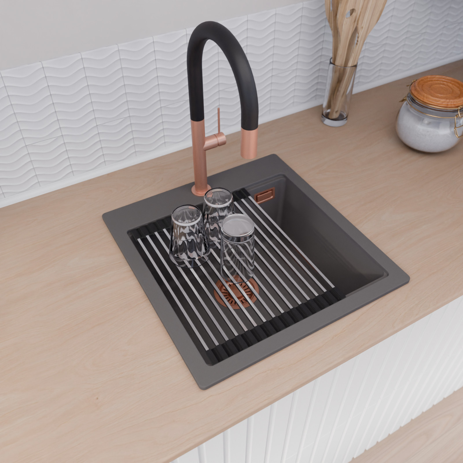 A mosogató prémium minőségű gránit kompozitból készült. Letisztult megjelenése mellett rendkívül praktikus, így bármilyen stílusú konyhába harmonikusan illeszkedik. A strapabíró gránit anyag hosszú távon is megbízható használatot garantál.