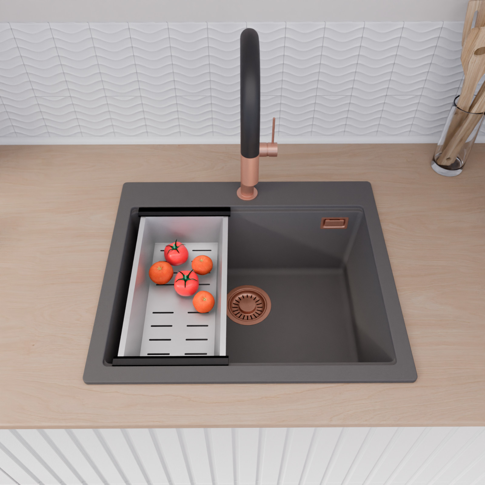 A mosogató prémium minőségű gránit kompozitból készült. Letisztult megjelenése mellett rendkívül praktikus, így bármilyen stílusú konyhába harmonikusan illeszkedik. A strapabíró gránit anyag hosszú távon is megbízható használatot garantál.
