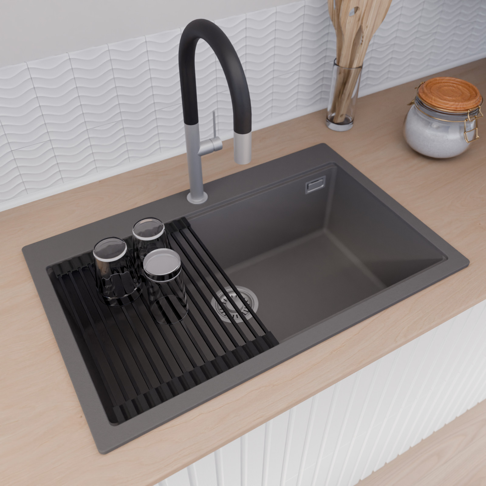 A mosogató prémium minőségű gránit kompozitból készült. Letisztult megjelenése mellett rendkívül praktikus, így bármilyen stílusú konyhába harmonikusan illeszkedik. A strapabíró gránit anyag hosszú távon is megbízható használatot garantál.