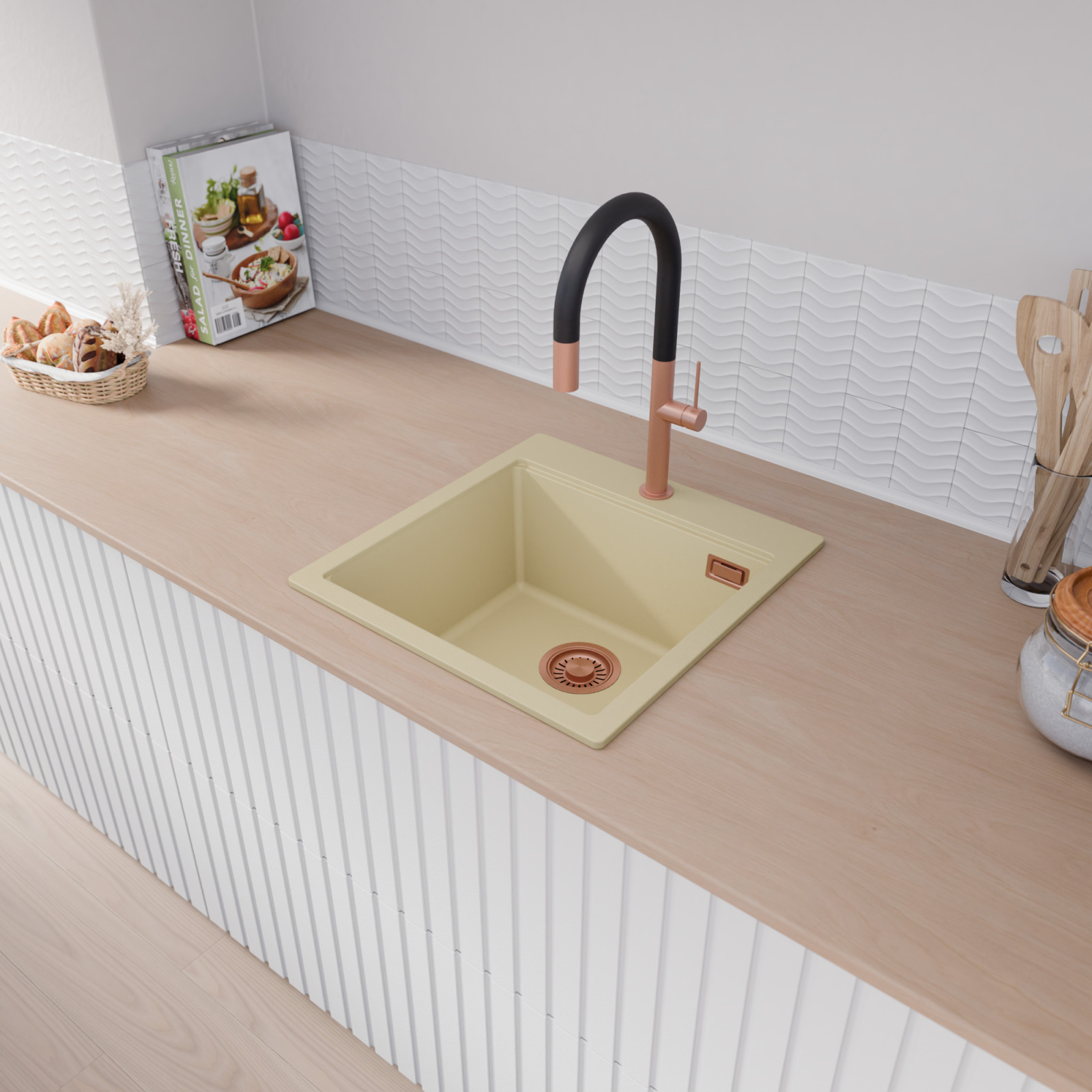 A mosogató prémium minőségű gránit kompozitból készült, amely kiváló ellenállást biztosít a mindennapi használat során keletkező karcolásokkal szemben. A strapabíró gránit felület hosszú távon is megőrzi esztétikus megjelenését, így a mosogató intenzív igénybevétel mellett is megmarad újszerű állapotában.