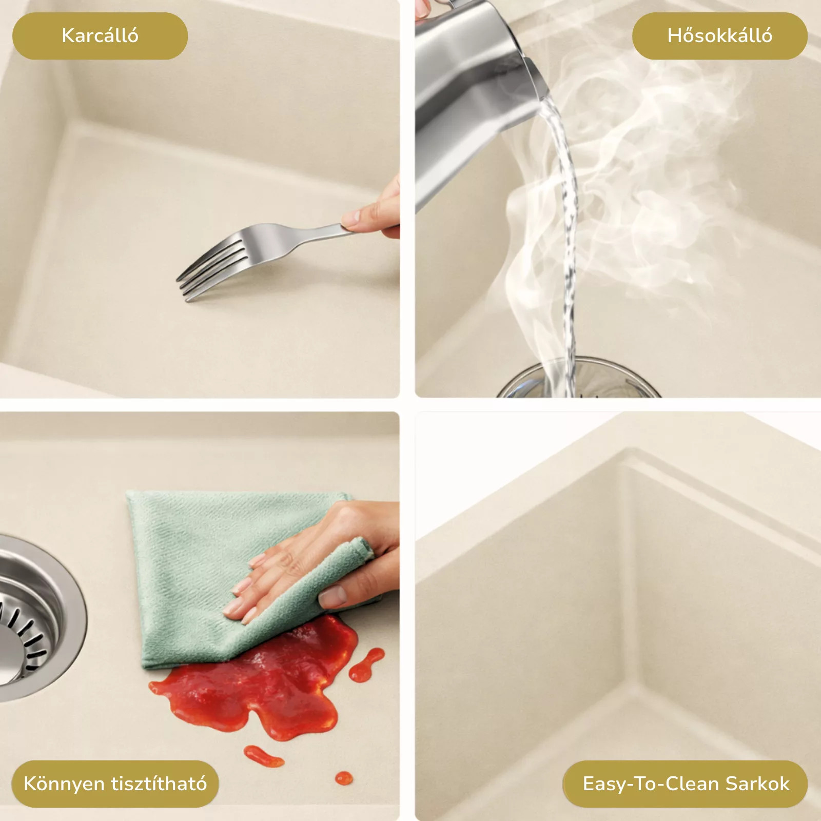 Mosogatónk magas természetes kőőrlemény-tartalmú gránit kompozitból készül, amely rendkívüli stabilitást és tartósságot biztosít. Az anyag ellenáll a magas hőmérsékletnek, a hirtelen hőingadozásoknak, valamint az ütéseknek és karcolásoknak is. Sima, zárt felülete könnyen tisztán tartható, ellenáll a foltosodásnak és az elszíneződéseknek, így hosszú éveken át megőrzi esztétikus megjelenését. Meggyőződésünk, hogy ezzel a gránit mosogatóval a mindennapi konyhai teendők kényelmesebbé és élvezetesebbé válnak.