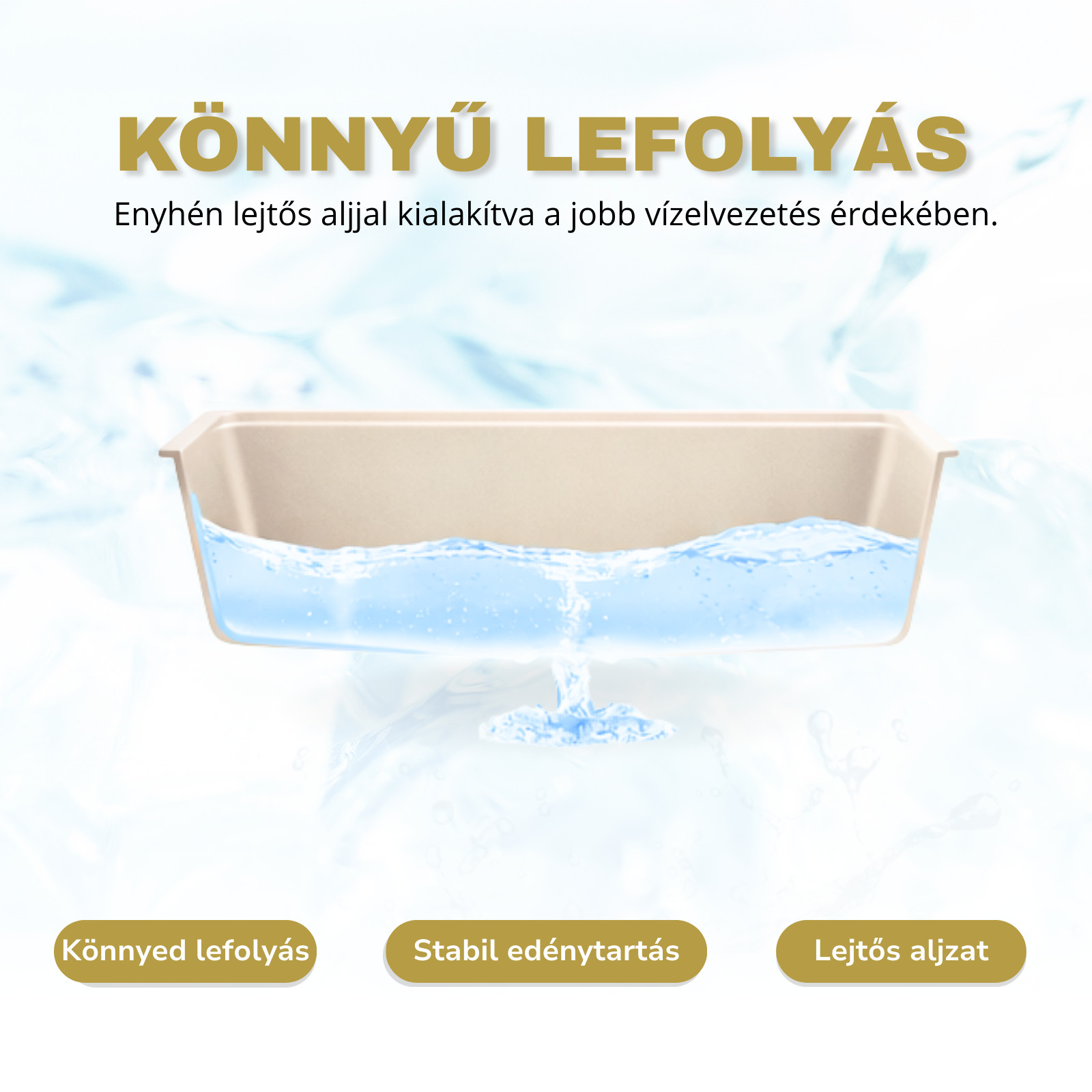 A mosogató felülete speciális kialakításának köszönhetően ellenáll a szennyeződések megtapadásának. A sima, zárt felület megakadályozza a lerakódások kialakulását, így a mosogató hosszabb ideig marad tiszta, és a mindennapi tisztítás is egyszerűbbé válik.