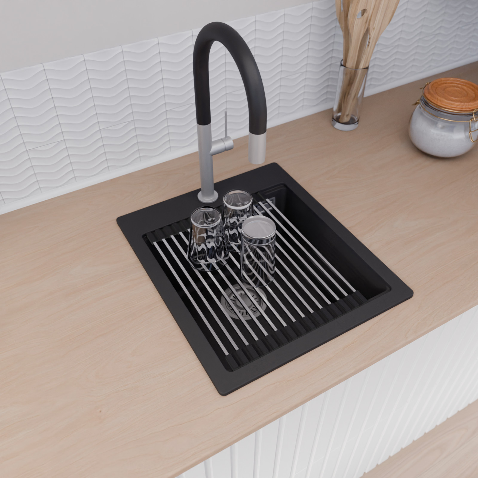 A mosogató prémium minőségű gránit kompozitból készült. Letisztult megjelenése mellett rendkívül praktikus, így bármilyen stílusú konyhába harmonikusan illeszkedik. A strapabíró gránit anyag hosszú távon is megbízható használatot garantál.