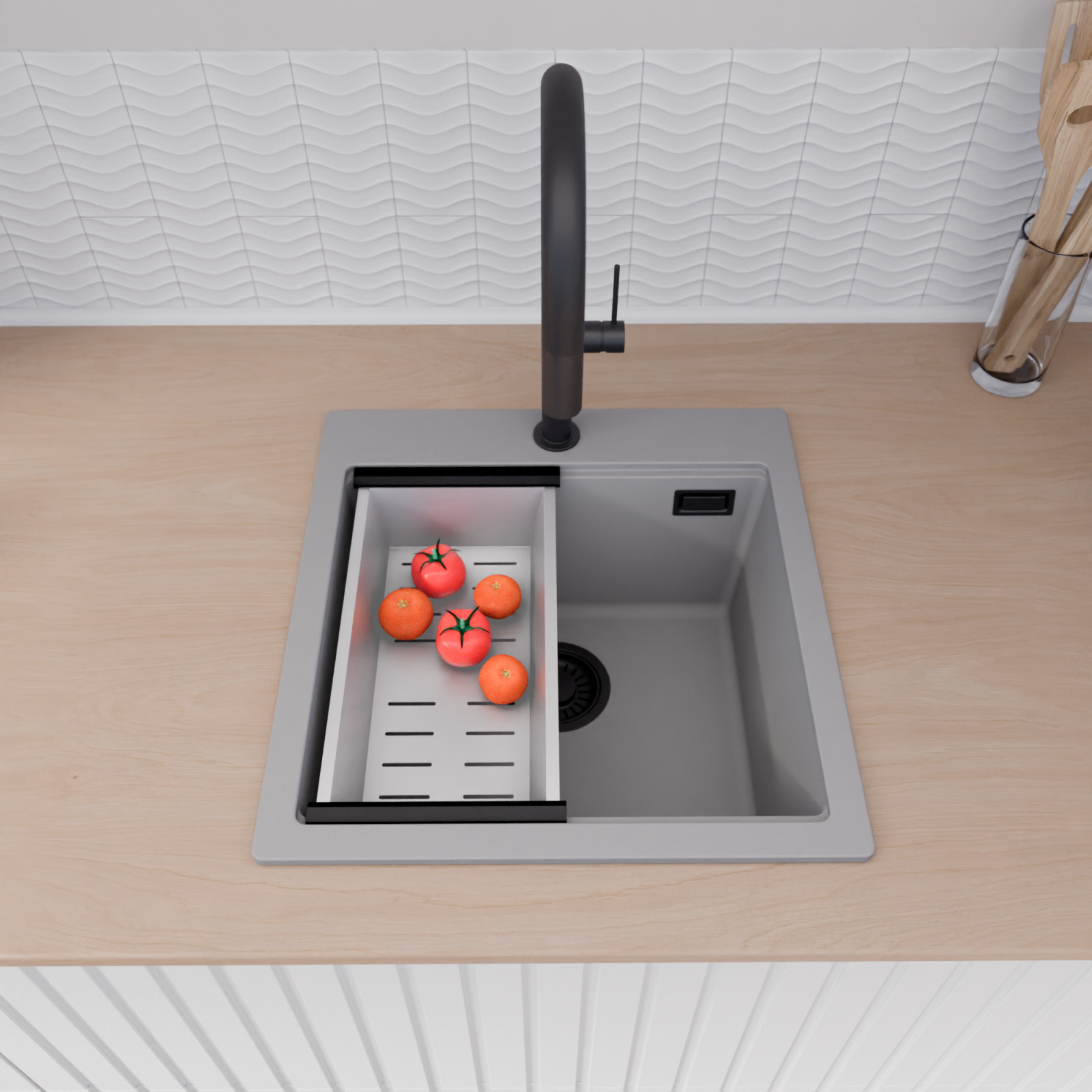 A mosogató prémium minőségű gránit kompozitból készült. Letisztult megjelenése mellett rendkívül praktikus, így bármilyen stílusú konyhába harmonikusan illeszkedik. A strapabíró gránit anyag hosszú távon is megbízható használatot garantál.