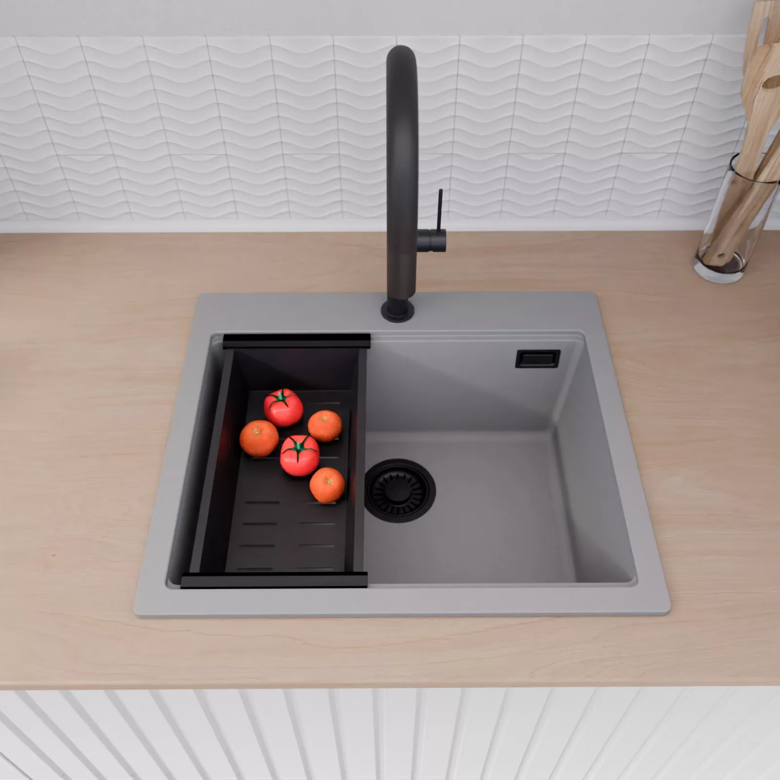 A mosogató prémium minőségű gránit kompozitból készült. Letisztult megjelenése mellett rendkívül praktikus, így bármilyen stílusú konyhába harmonikusan illeszkedik. A strapabíró gránit anyag hosszú távon is megbízható használatot garantál.