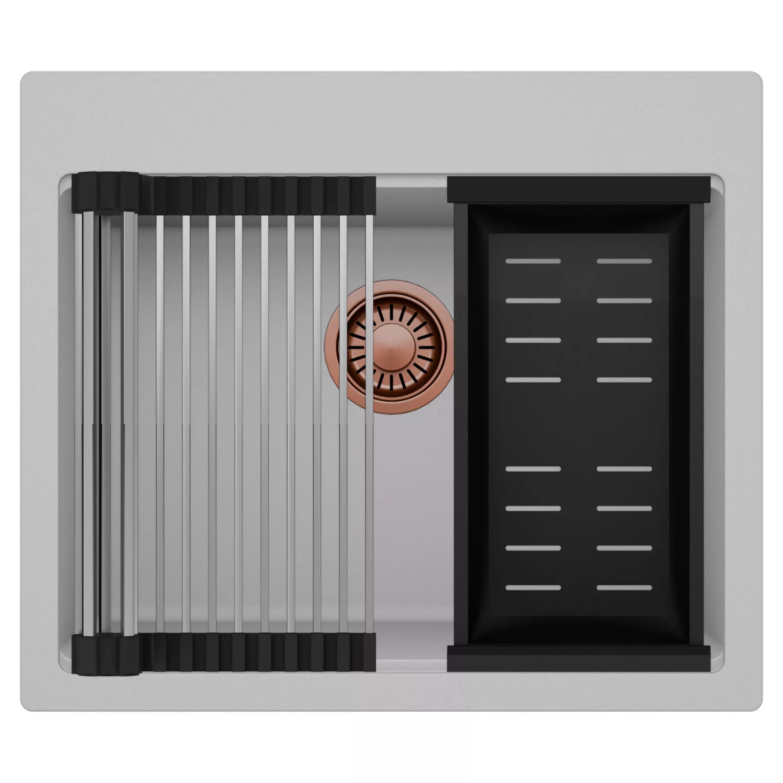 Termék mérete: 58x50 cm Szekrényméreti igény: 60 cm Medence mérete: 52x39x21,5 cm Medencék száma: Egymedencés Felhasználhatóság: Pultba építhető Könnyített fúratok száma: 3 Anyag: Gránit Anyagvastagság: 8-10 mm Tartozékok: Mosogatótálca, rozsdamentes acél csepegtetőrács, matt fekete csepegtetőkosár, szifon - túlfolyóval és lefolyó takaróval Szifon szín: Szálcsiszolt réz Lefolyó takaró anyaga: Rozsdamentes acél HomeDepo SmartEdge Többfunkciós Peremrendszer