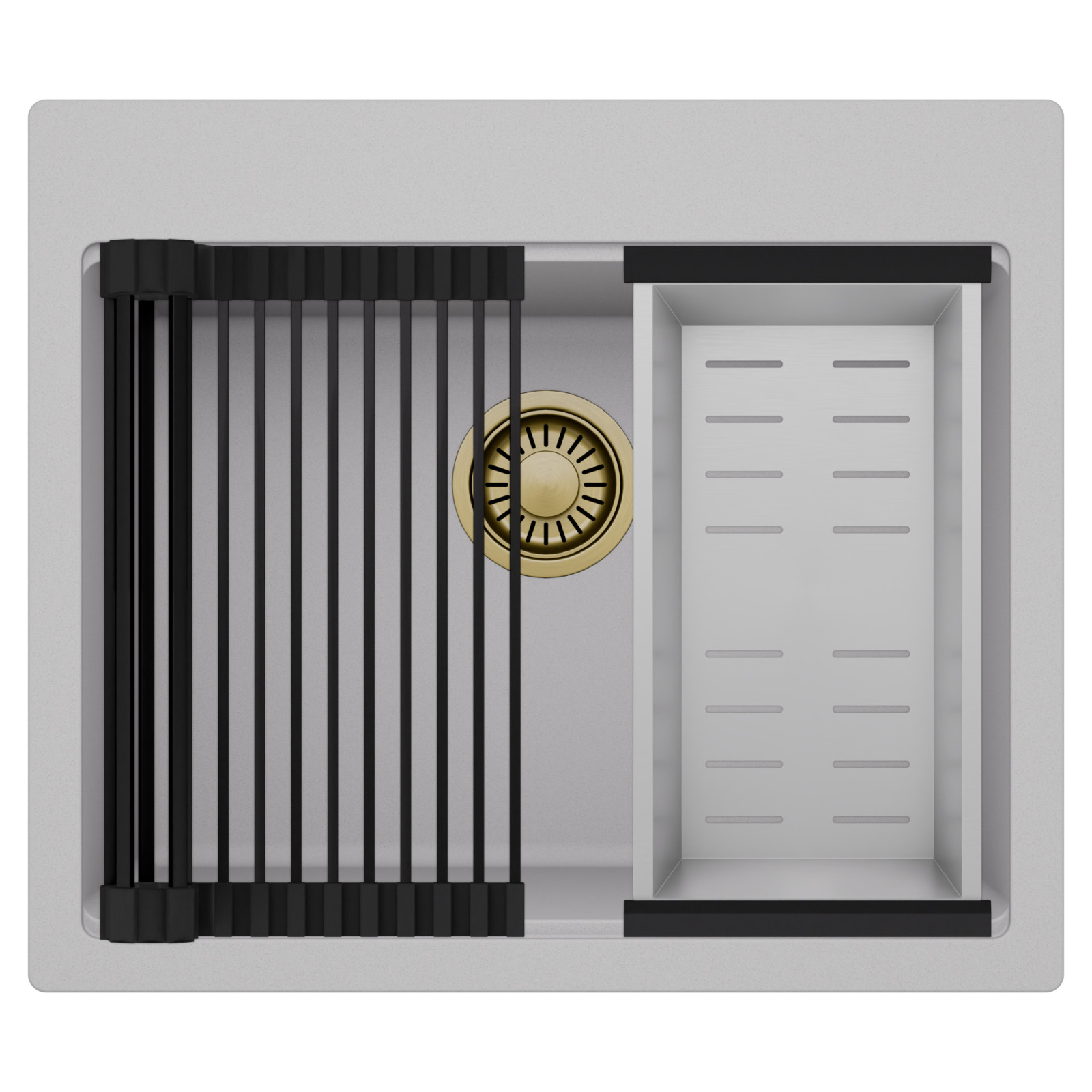 Termék mérete: 58x50 cm Szekrényméreti igény: 60 cm Medence mérete: 52x39x21,5 cm Medencék száma: Egymedencés Felhasználhatóság: Pultba építhető Könnyített fúratok száma: 3 Anyag: Gránit Anyagvastagság: 8-10 mm Tartozékok: Mosogatótálca, matt fekete csepegtetőrács, krómozott csepegtetőkosár, szifon - túlfolyóval és lefolyó takaróval Szifon szín: Szálcsiszolt arany Lefolyó takaró anyaga: Rozsdamentes acél HomeDepo SmartEdge Többfunkciós Peremrendszer