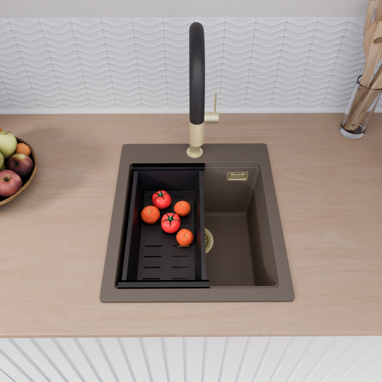 A mosogató prémium minőségű gránit kompozitból készült. Letisztult megjelenése mellett rendkívül praktikus, így bármilyen stílusú konyhába harmonikusan illeszkedik. A strapabíró gránit anyag hosszú távon is megbízható használatot garantál.