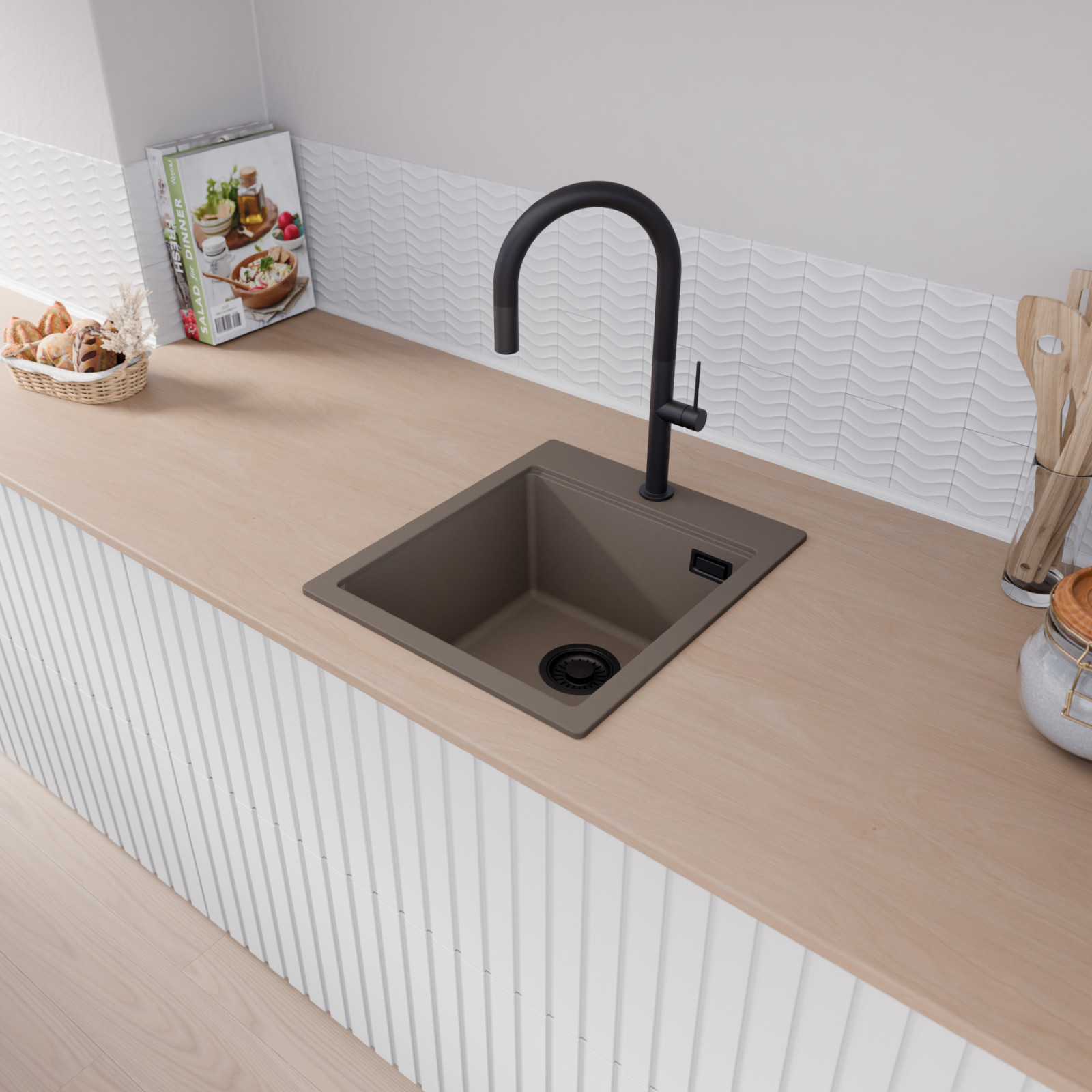 A mosogató prémium minőségű gránit kompozitból készült, amely kiváló ellenállást biztosít a mindennapi használat során keletkező karcolásokkal szemben. A strapabíró gránit felület hosszú távon is megőrzi esztétikus megjelenését, így a mosogató intenzív igénybevétel mellett is megmarad újszerű állapotában.