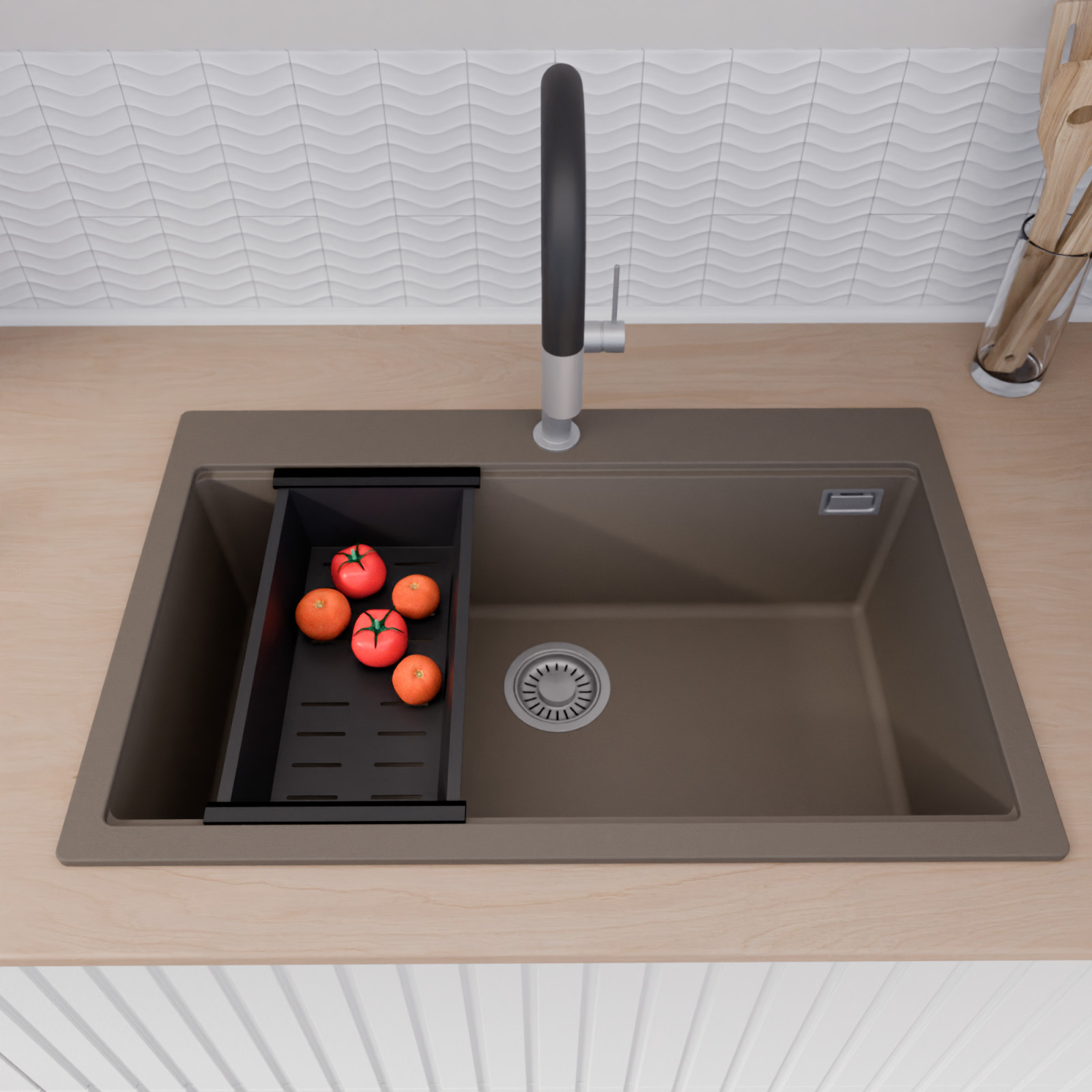HD Infinity Tortora 78 egymedencés mosogatótálca szett, csepegtetőráccsal és kosárral, tortora