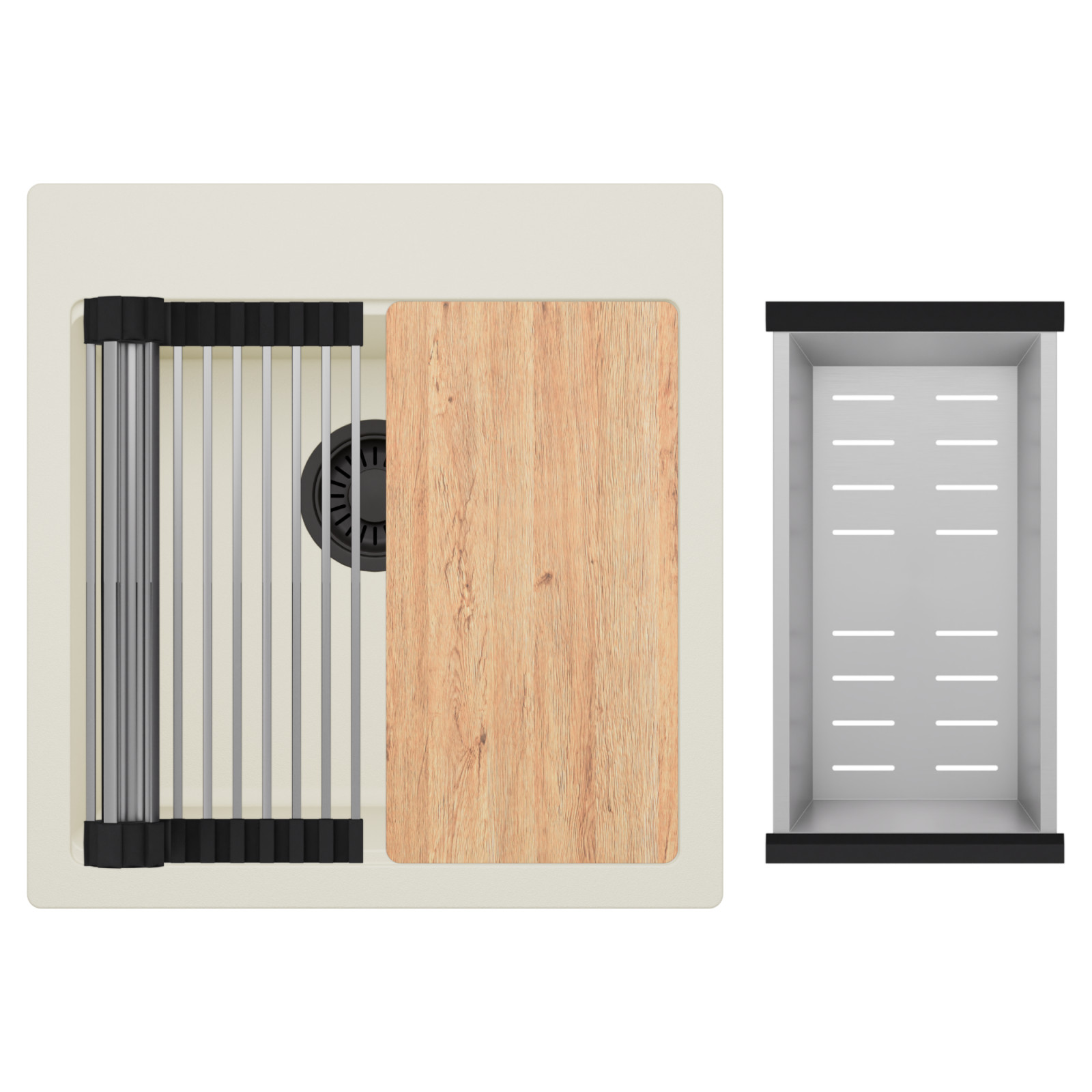 HD Infinity White 48 egymedencés gránit mosogatótálca szett, vágódeszkával, acél csepegtetőráccsal és kosárral, tört fehér színben, matt fekete leeresztő szifonnal