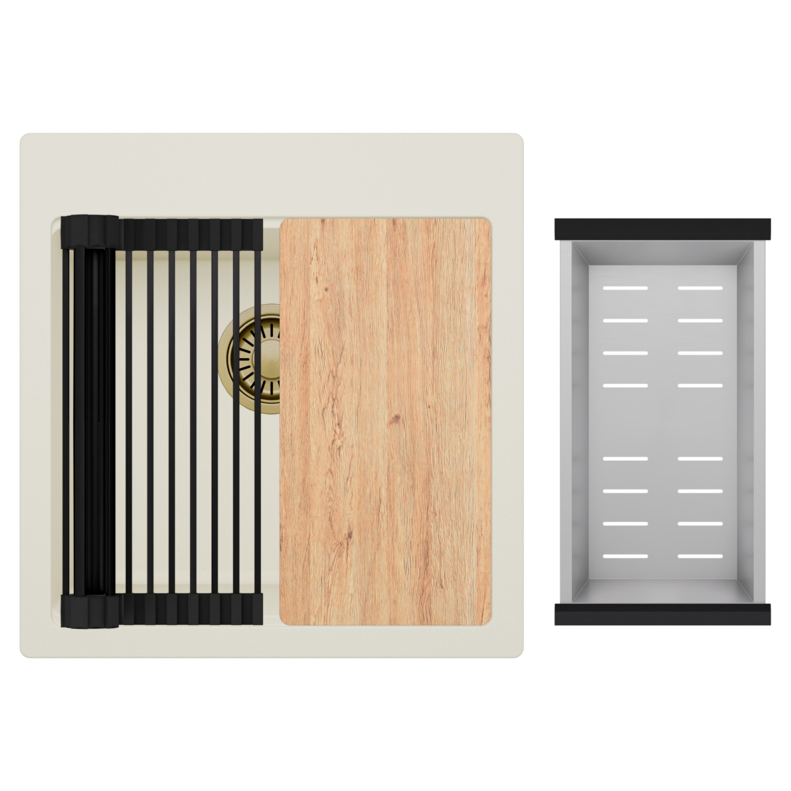 HD Infinity White 48 egymedencés gránit mosogatótálca szett, vágódeszkával, matt fekete csepegtetőráccsal és krómozott kosárral, tört fehér színben, szálcsiszolt arany leeresztő szifonnal