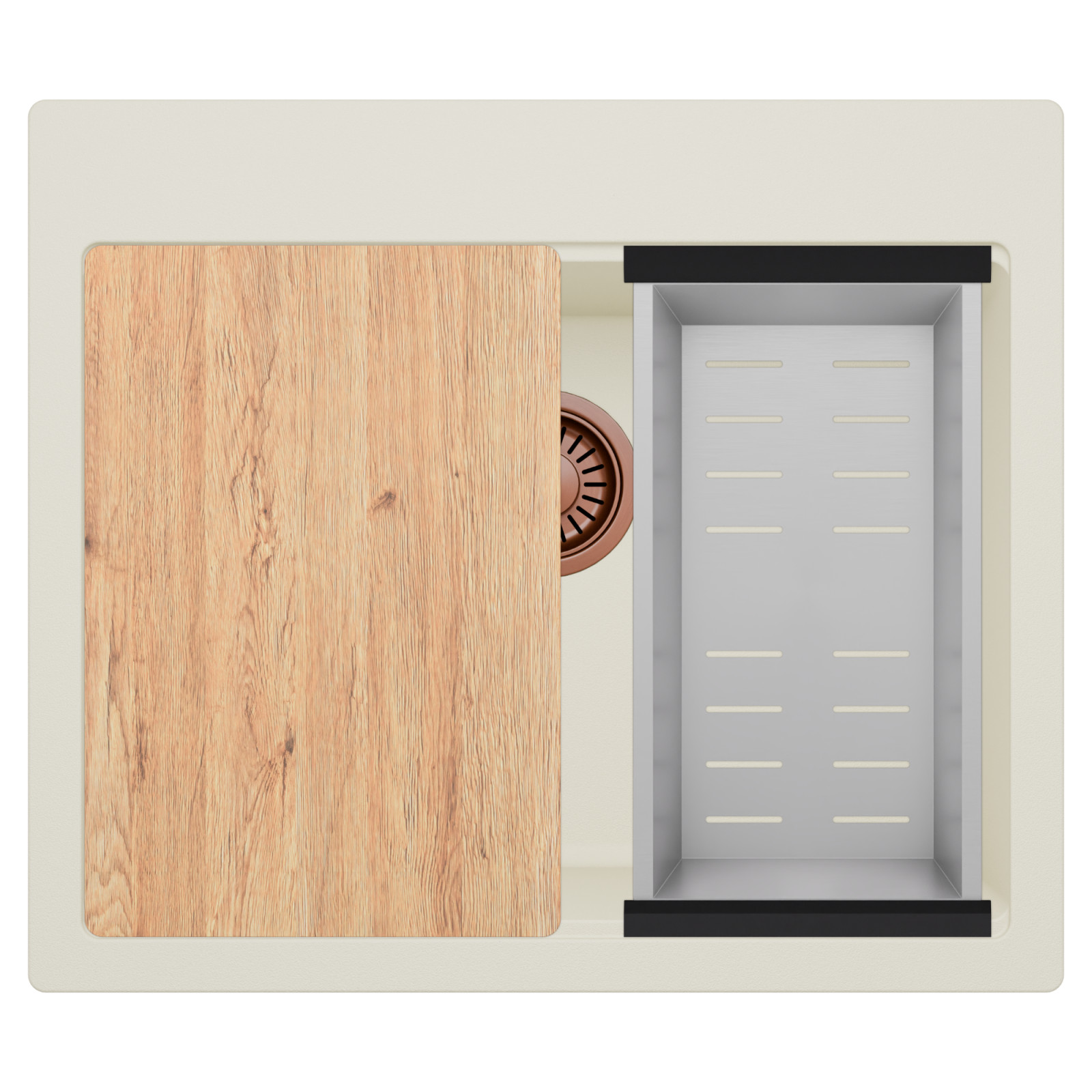 HD Infinity White 58 egymedencés gránit mosogatótálca szett, vágódeszkával, acél csepegtetőkosárral, tört fehér színben, szálcsiszolt réz leeresztő szifonnal