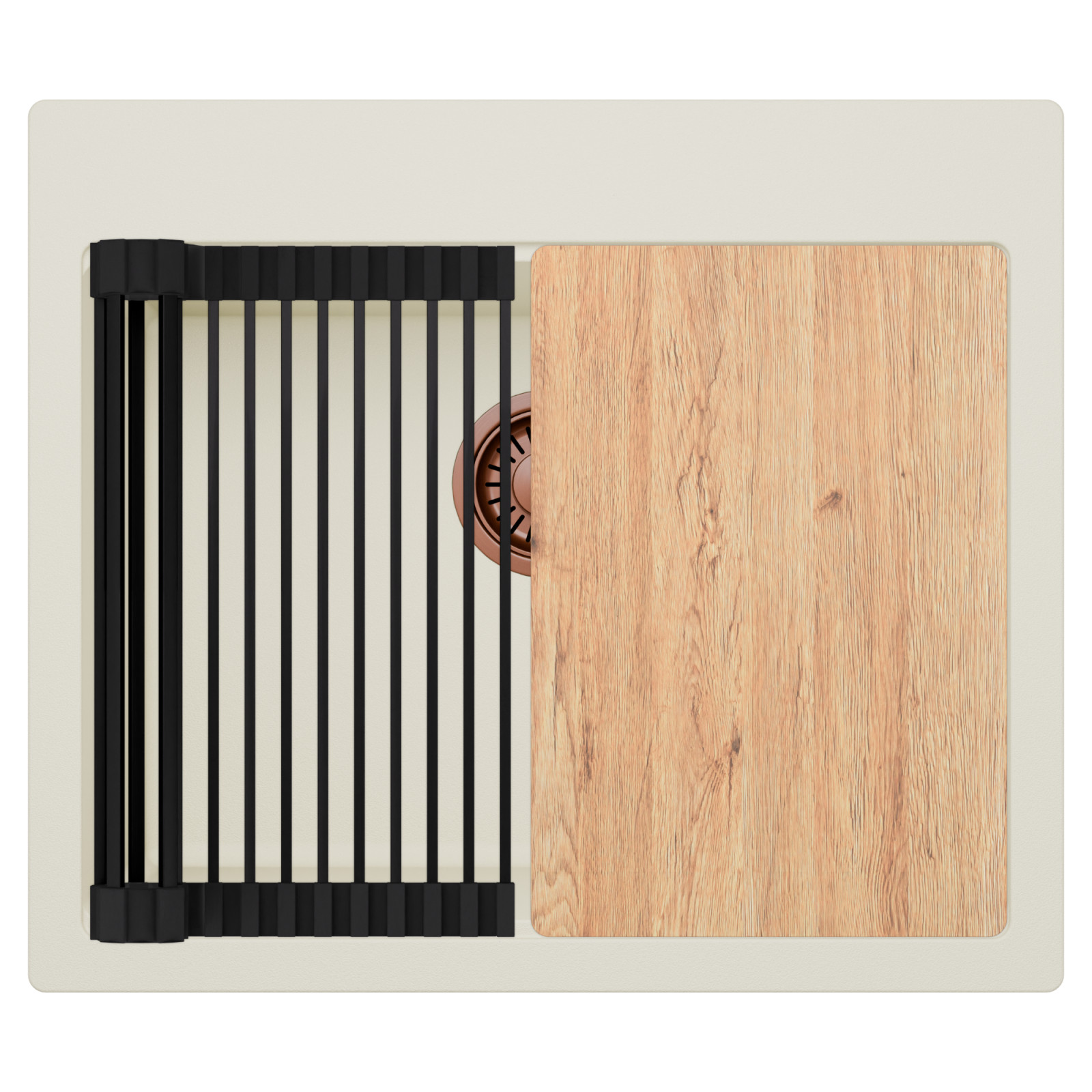 HD Infinity White 58 egymedencés gránit mosogatótálca szett, vágódeszkával, matt fekete csepegtetőráccsal, tört fehér színben, szálcsiszolt réz leeresztő szifonnal
