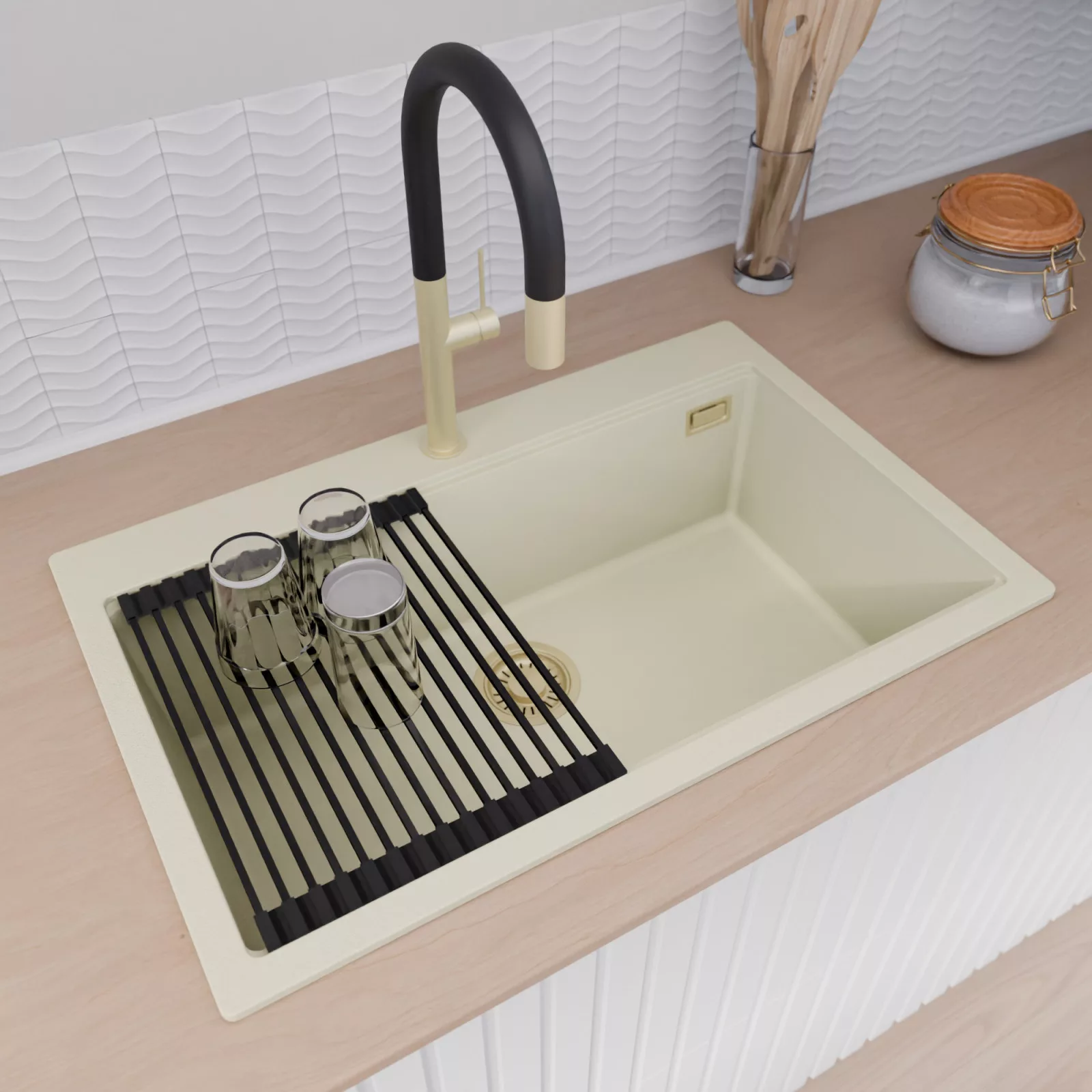 A mosogató prémium minőségű gránit kompozitból készült. Letisztult megjelenése mellett rendkívül praktikus, így bármilyen stílusú konyhába harmonikusan illeszkedik. A strapabíró gránit anyag hosszú távon is megbízható használatot garantál.