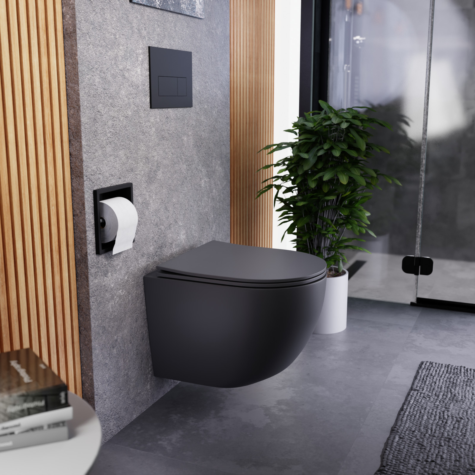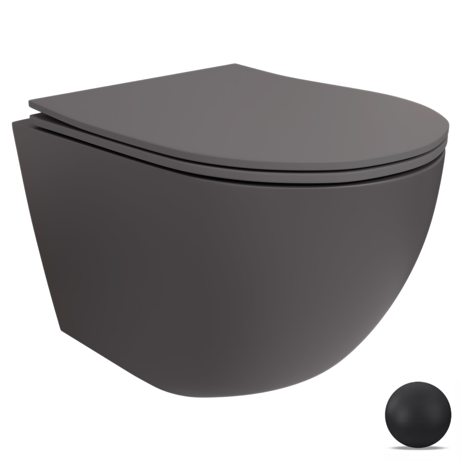 HD Lea Matt Antracit perem nélküli mély öblítésű íves fali WC slim "P" tetővel és matt fekete zsanérral
