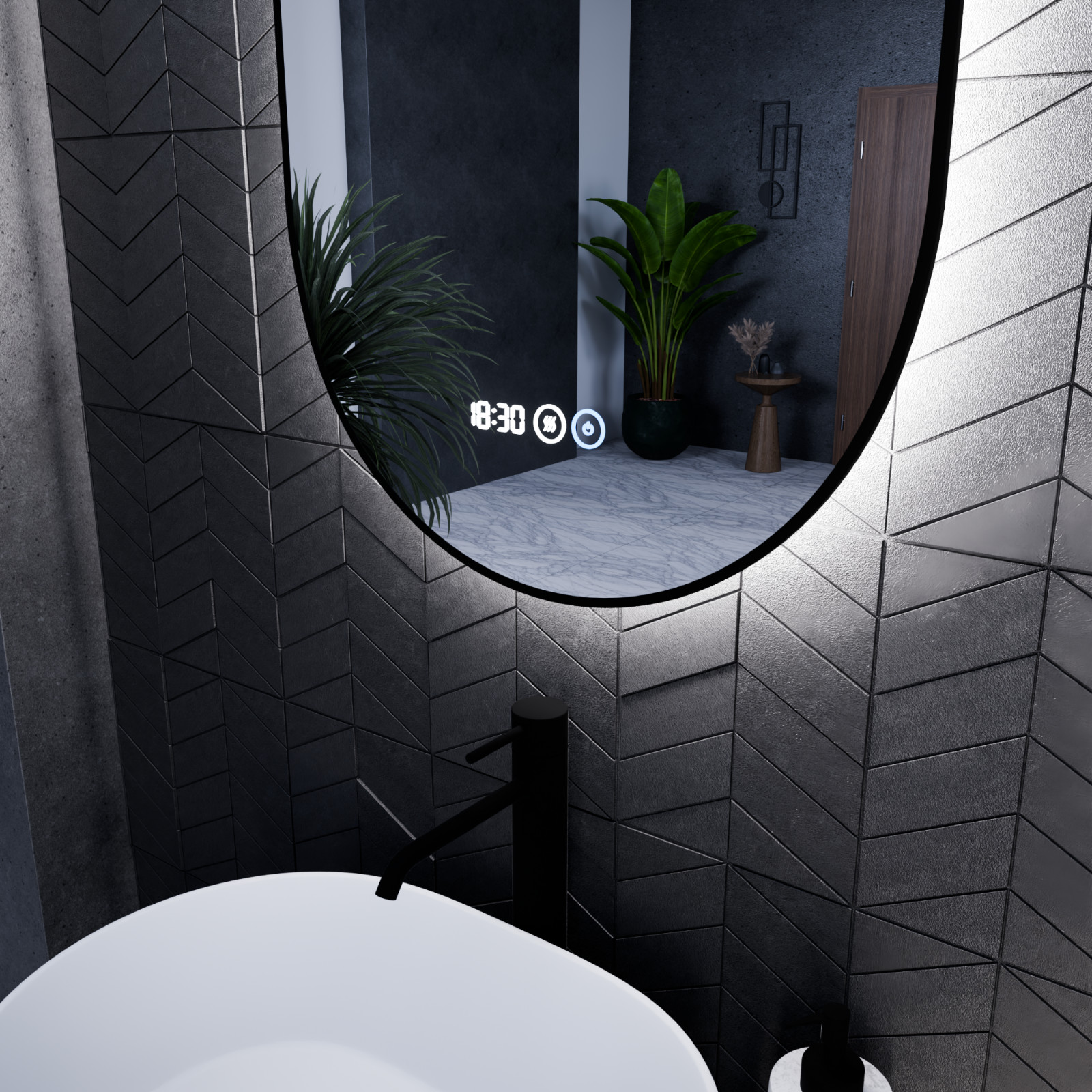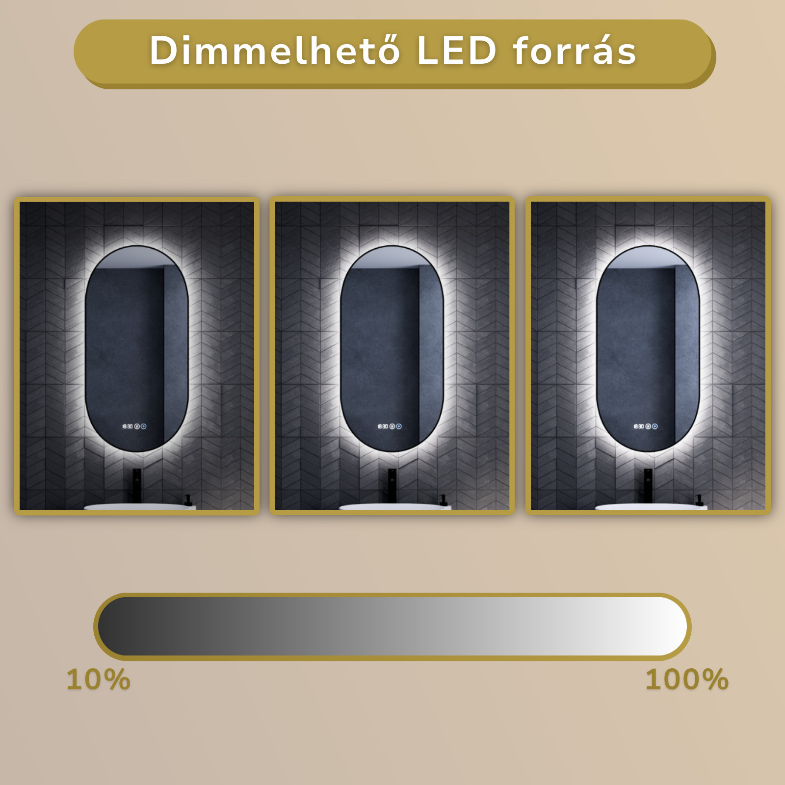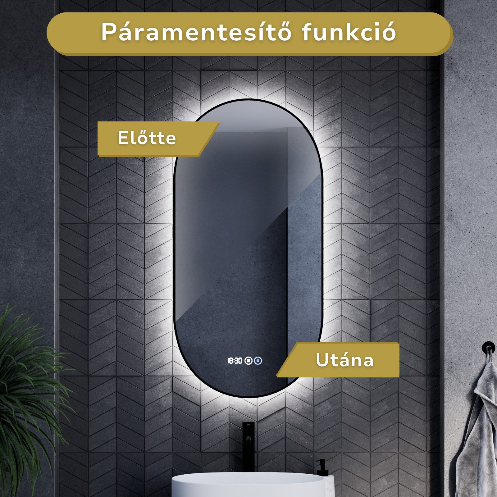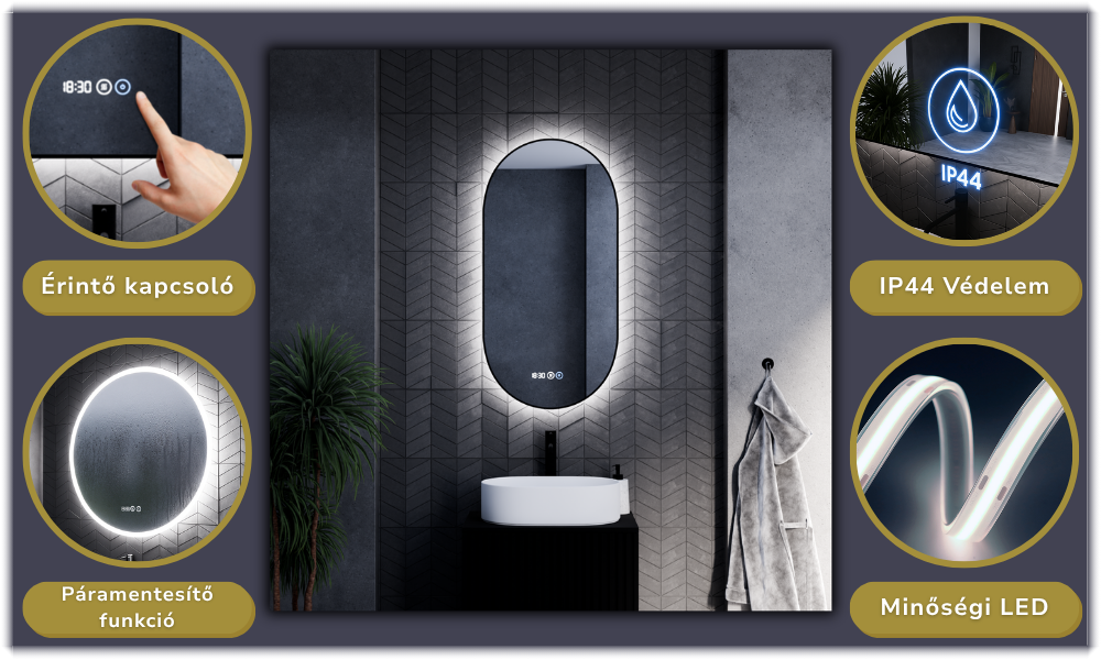 - Tükör funkciók: Ambient világítás, érintés kapcsoló, digitális óra, páramentesítő fűtés