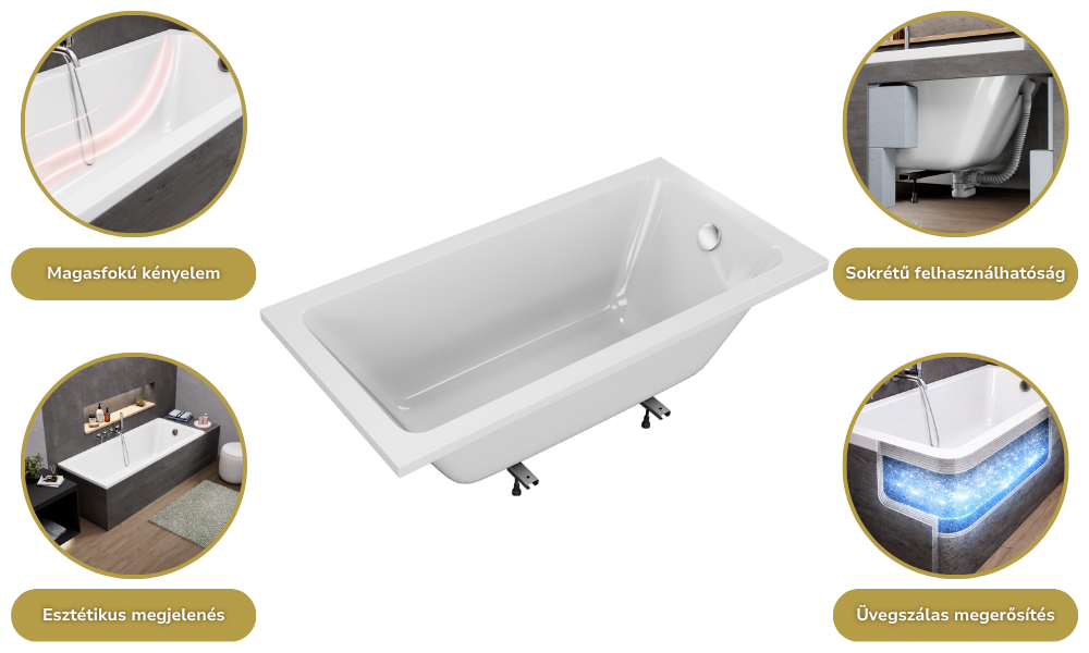 A fürdőkádjaink sokrétű módon felhasználhatóak: burkolható, lábra szerelhető, valamint padlóba süllyeszthető. A fürdőkádhoz tartozó elő és/vagy oldallap könnyedén felhelyezhető.