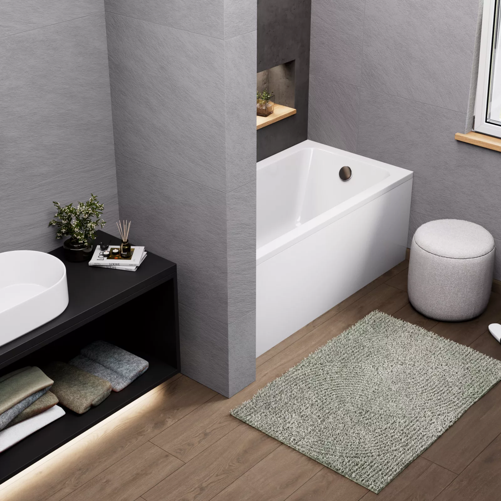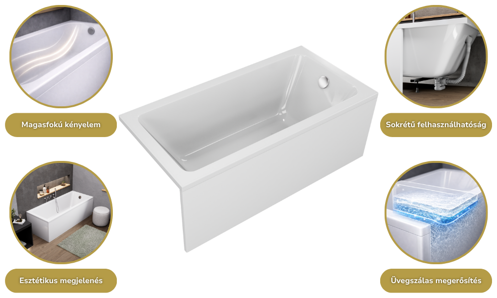 A fürdőkádjaink sokrétű módon felhasználhatóak: burkolható, lábra szerelhető, valamint padlóba süllyeszthető. A fürdőkádhoz tartozó elő és/vagy oldallap könnyedén felhelyezhető.