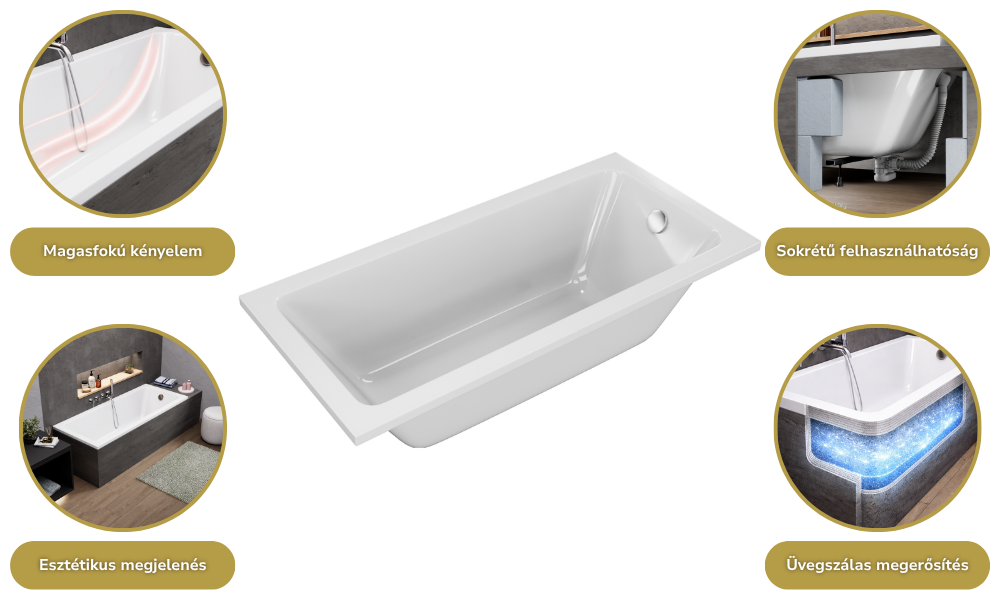 A fürdőkádjaink sokrétű módon felhasználhatóak: burkolható, lábra szerelhető, valamint padlóba süllyeszthető. A fürdőkádhoz tartozó elő és/vagy oldallap könnyedén felhelyezhető.