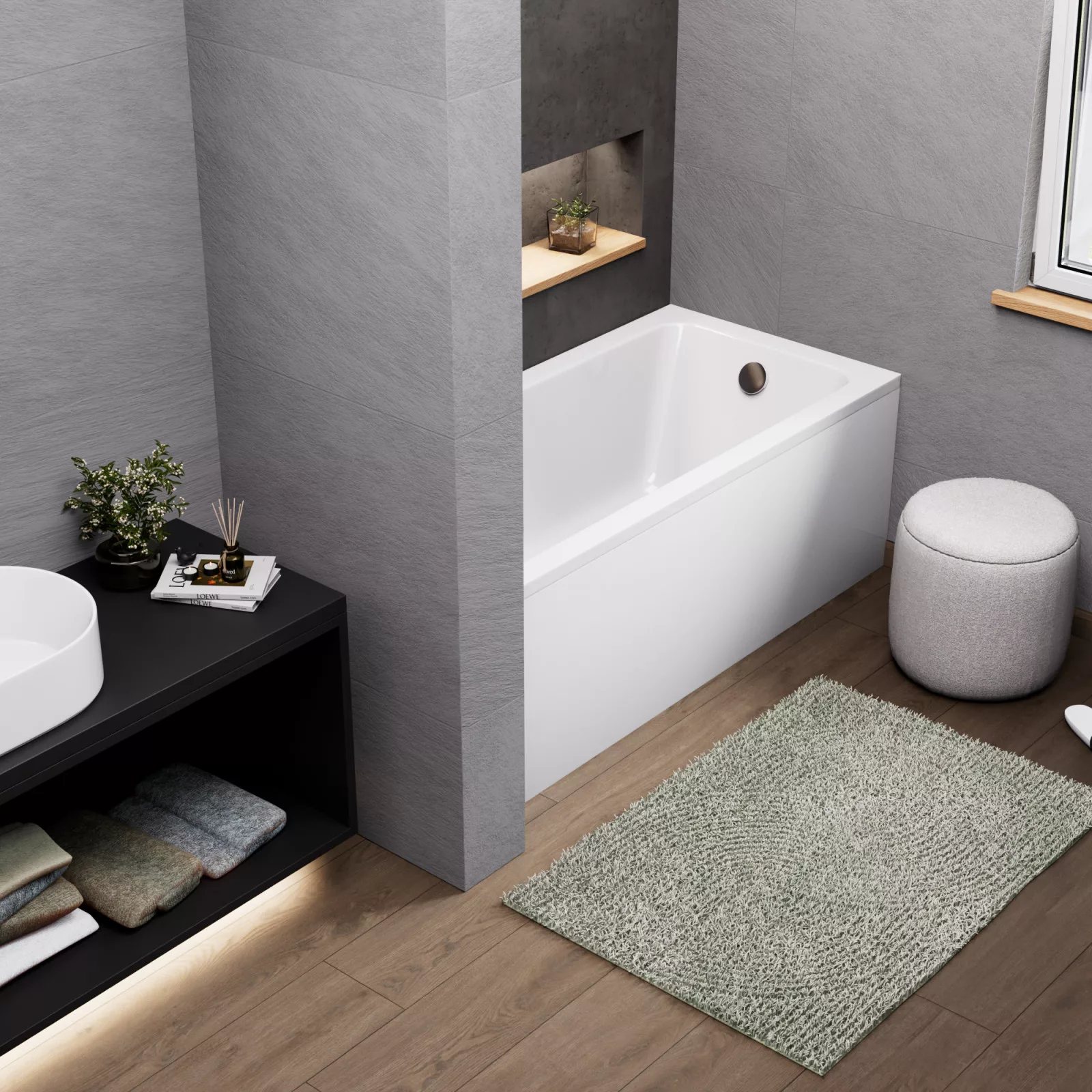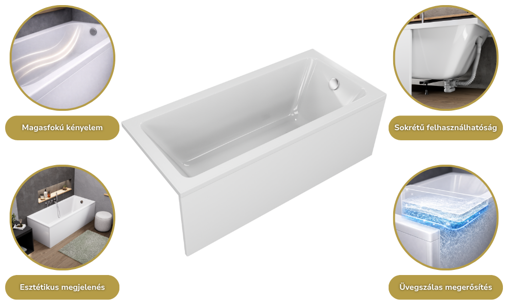 A fürdőkádjaink sokrétű módon felhasználhatóak: burkolható, lábra szerelhető, valamint padlóba süllyeszthető. A fürdőkádhoz tartozó elő és/vagy oldallap könnyedén felhelyezhető.