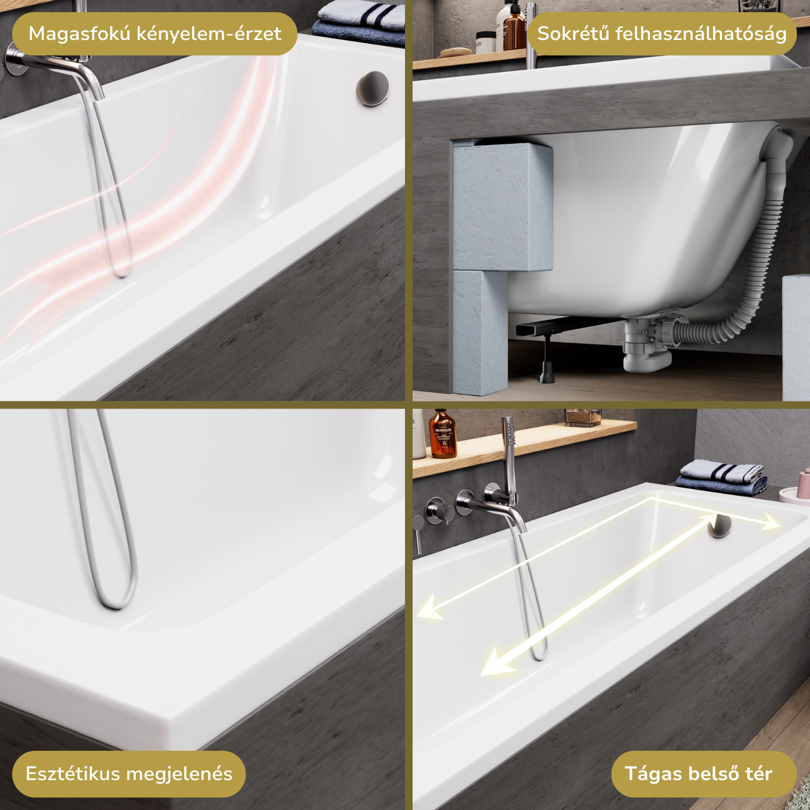 A fürdőkádjaink sokrétű módon felhasználhatóak: burkolható, lábra szerelhető, valamint padlóba süllyeszthető. A fürdőkádhoz tartozó elő és/vagy oldallap könnyedén felhelyezhető.