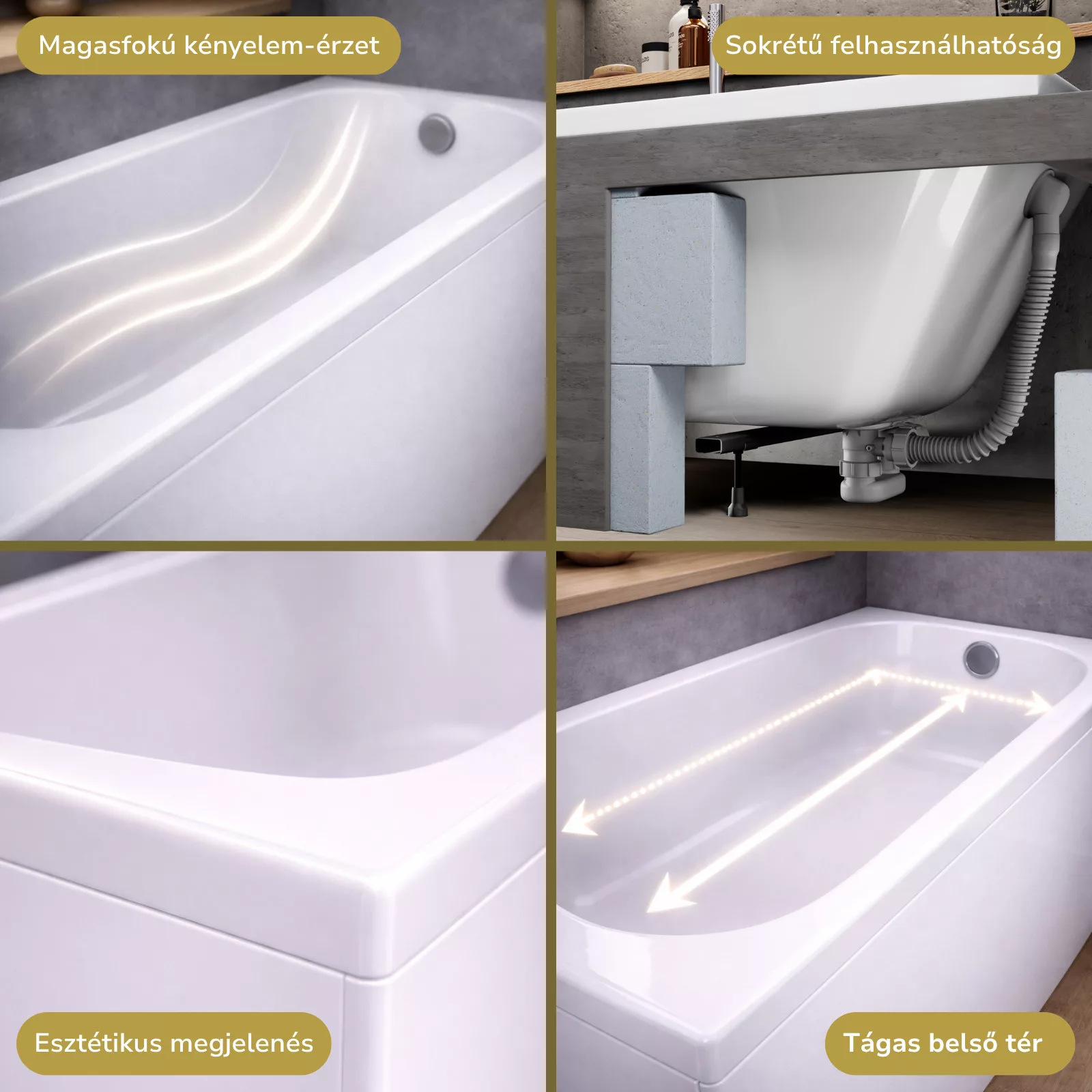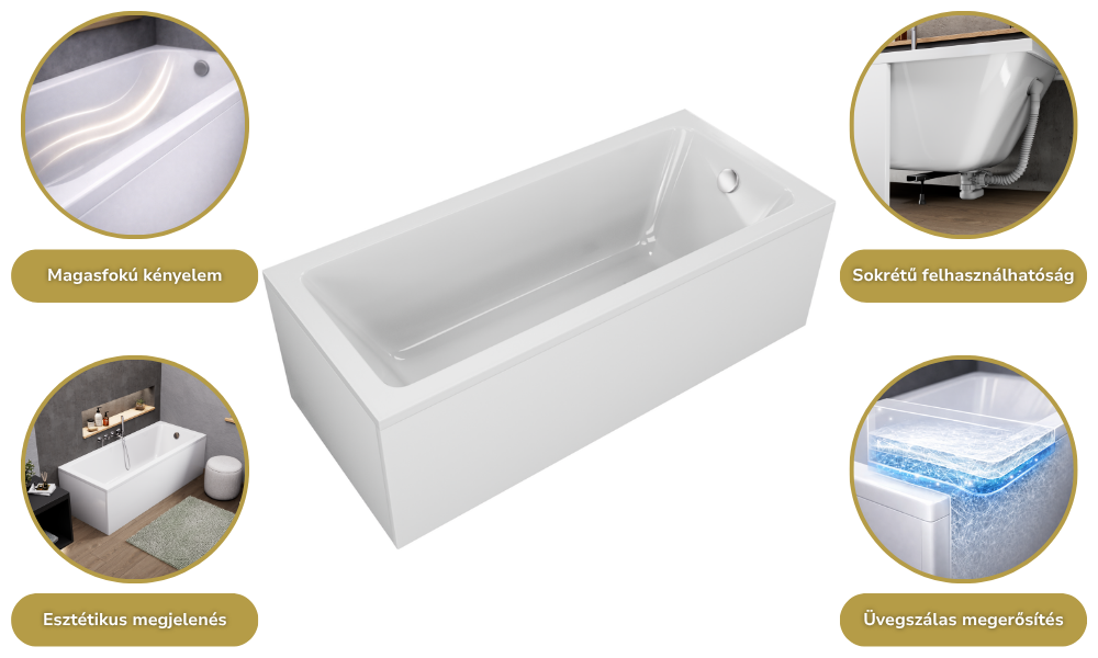 A fürdőkádjaink sokrétű módon felhasználhatóak: burkolható, lábra szerelhető, valamint padlóba süllyeszthető. A fürdőkádhoz tartozó elő és/vagy oldallap könnyedén felhelyezhető.