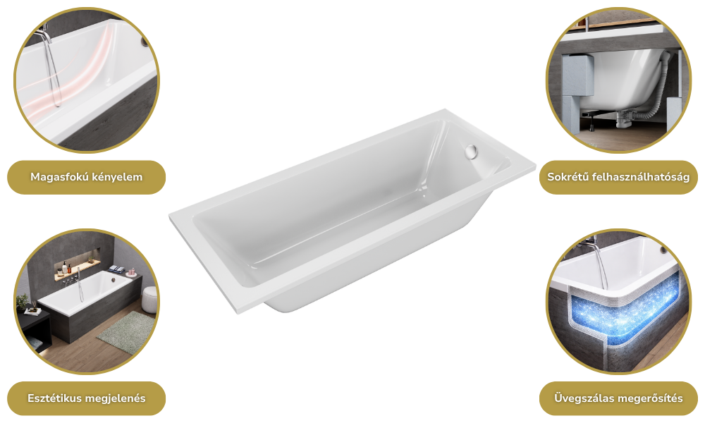 A fürdőkádjaink sokrétű módon felhasználhatóak: burkolható, lábra szerelhető, valamint padlóba süllyeszthető. A fürdőkádhoz tartozó elő és/vagy oldallap könnyedén felhelyezhető.