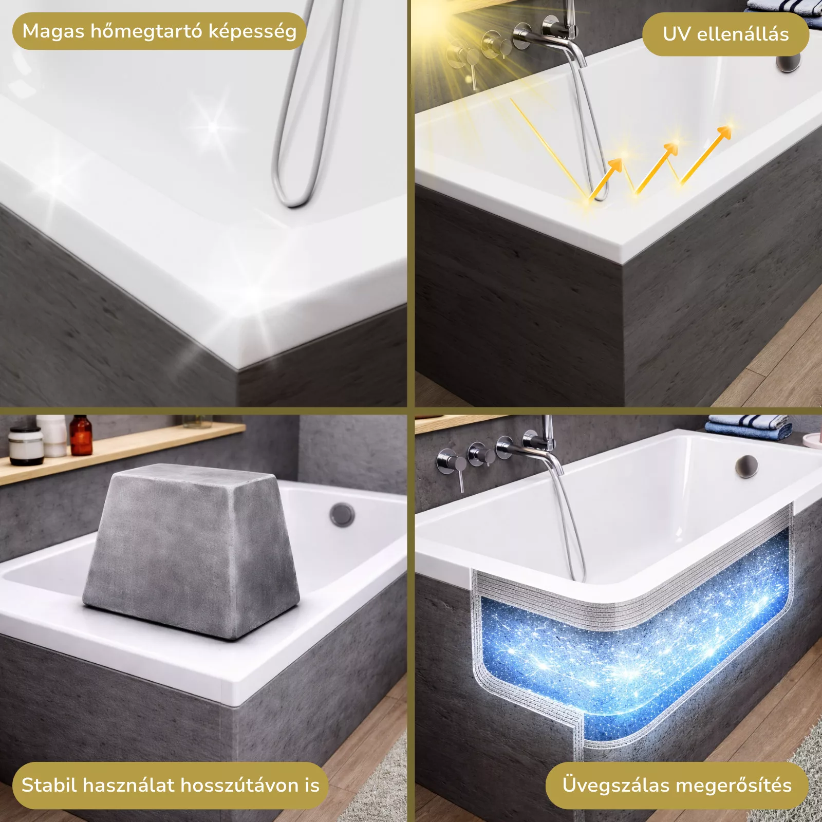 A fürdőkád ellenáll az UV sugárzásnak (nap, fénycsövek, LED izzók) és nem bocsát ki kémiai vegyületeket, ami bőrbaráttá teszi és biztosítja, hogy nem fakul ki a hosszú évek során.