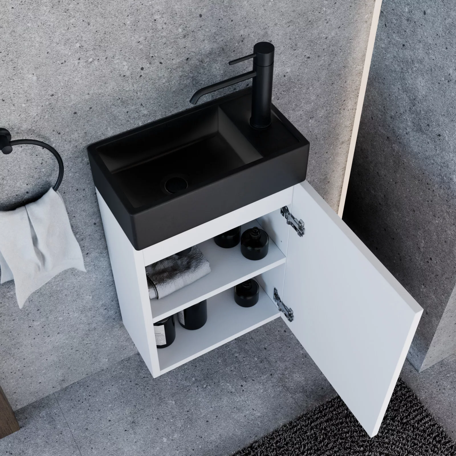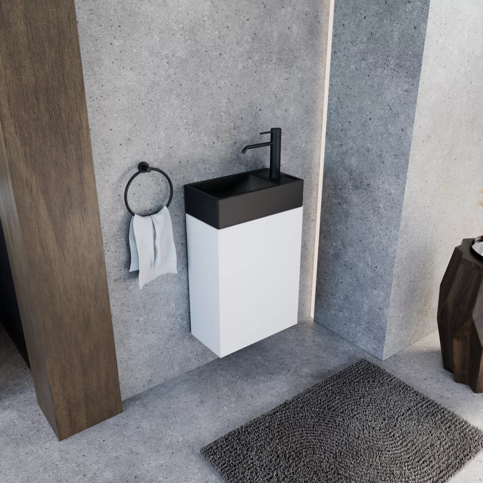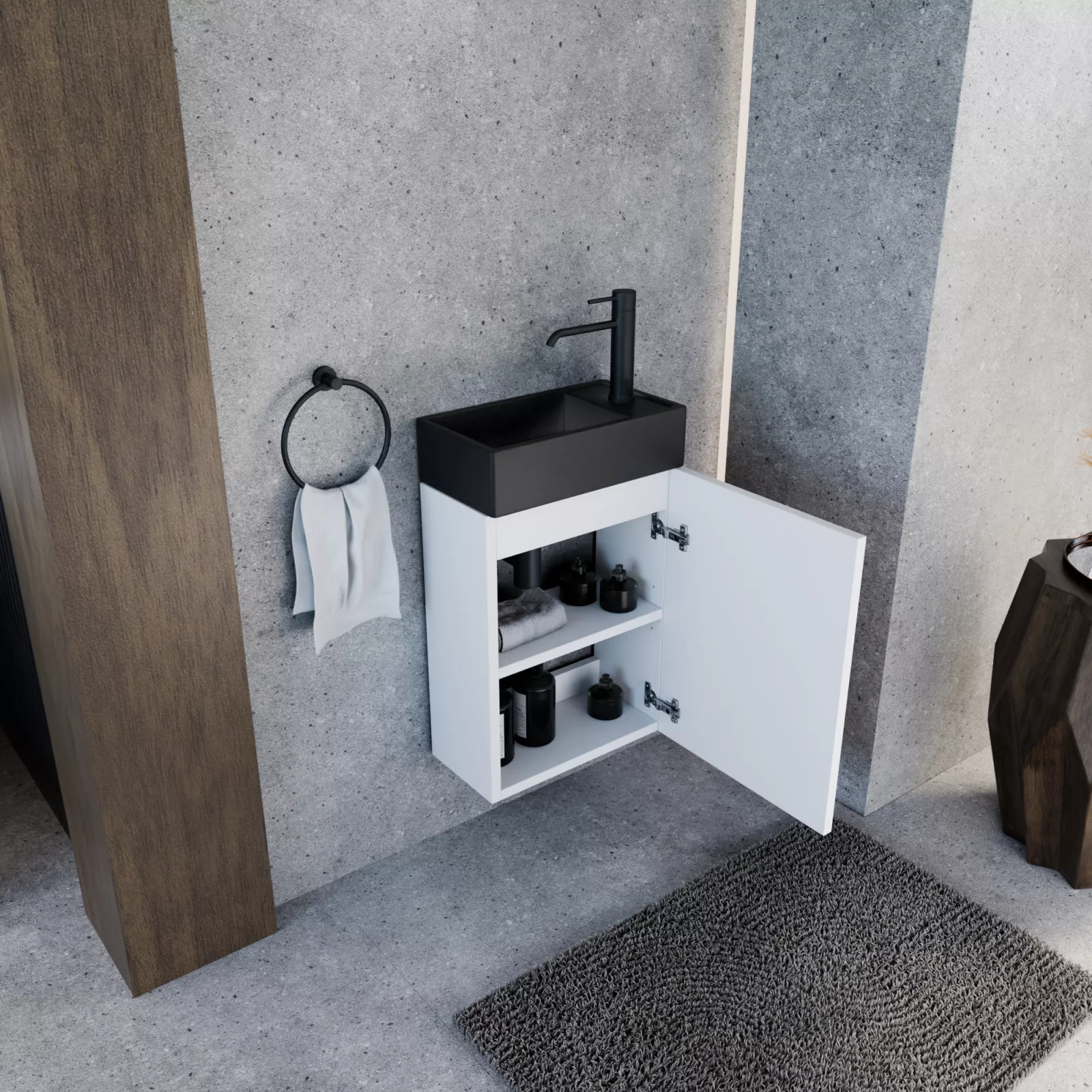 HD Lyon Matt White 40 fali mosdószekrény, matt fehér színben, matt fekete kerámia mosdóval