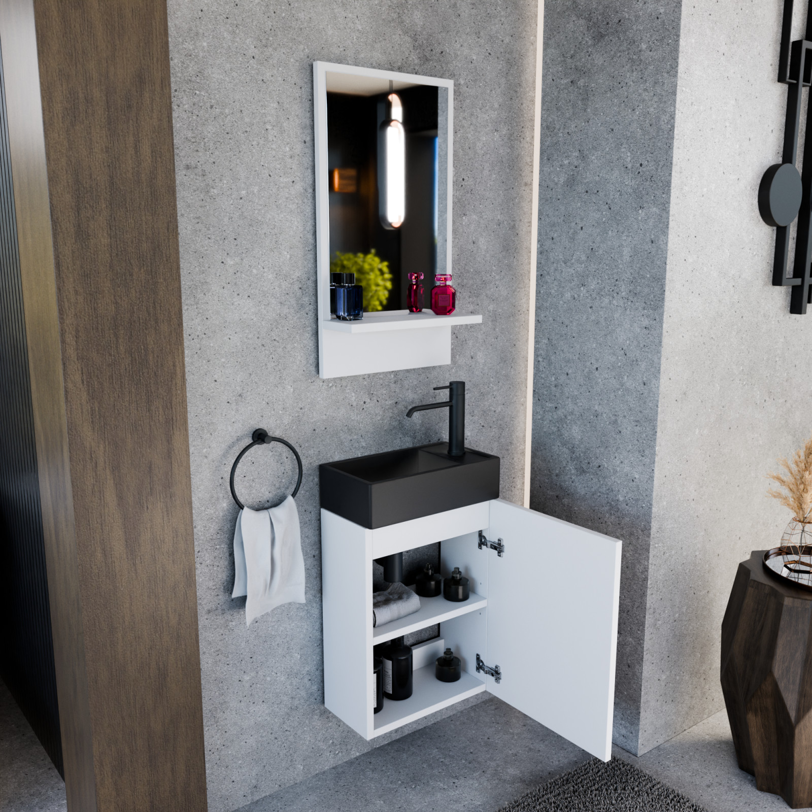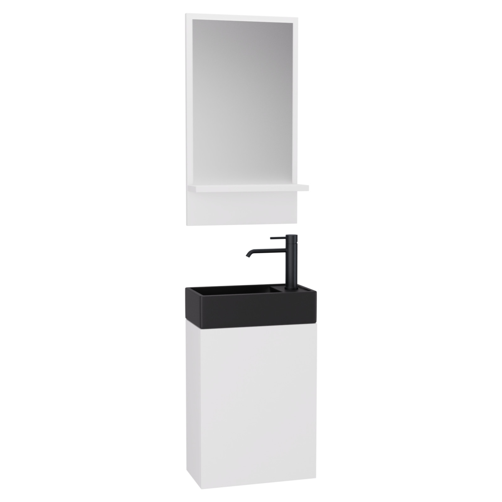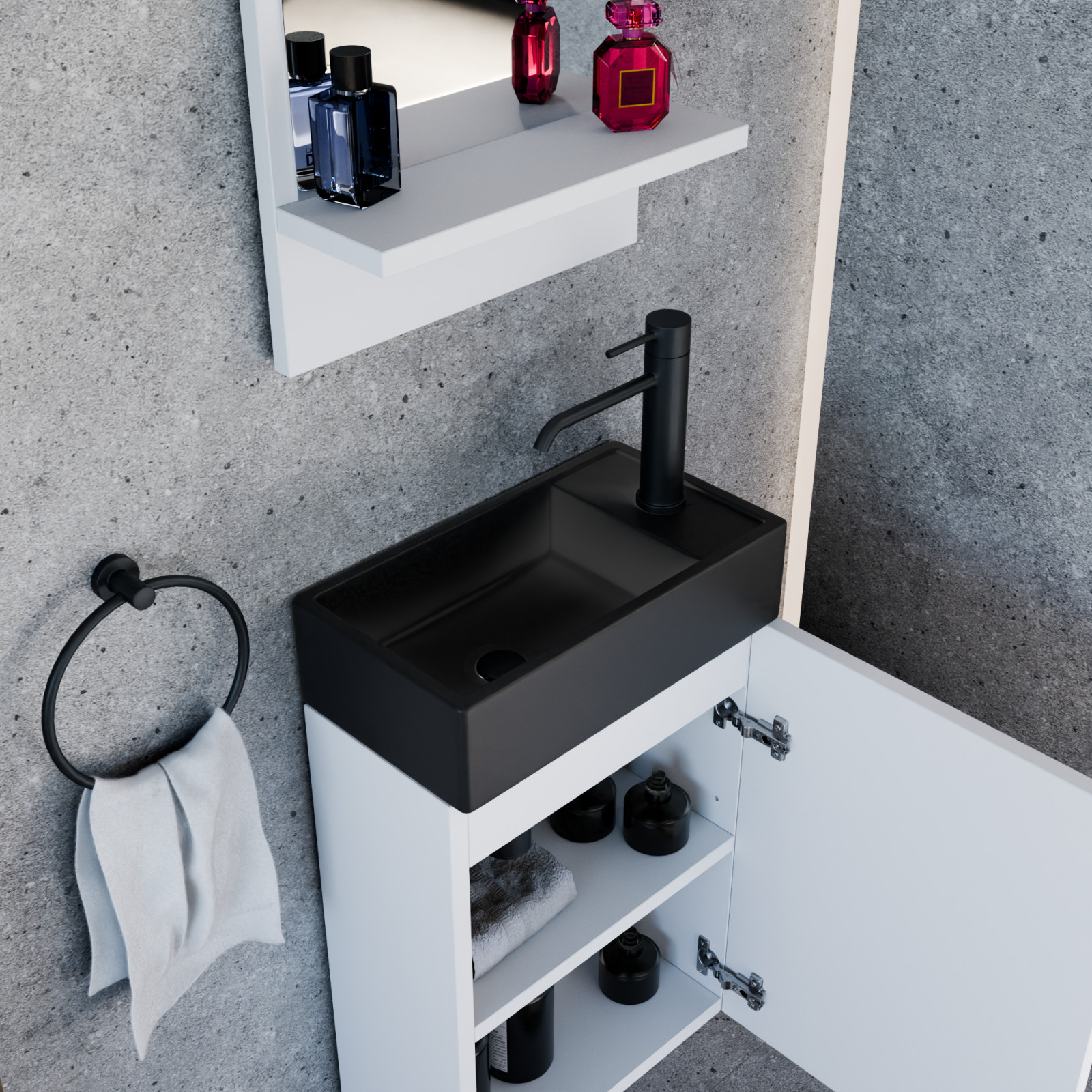 HD Lyon Matt White 40 fali mosdószekrény, matt fehér színben, matt fekete kerámia mosdóval és polcos tükörrel