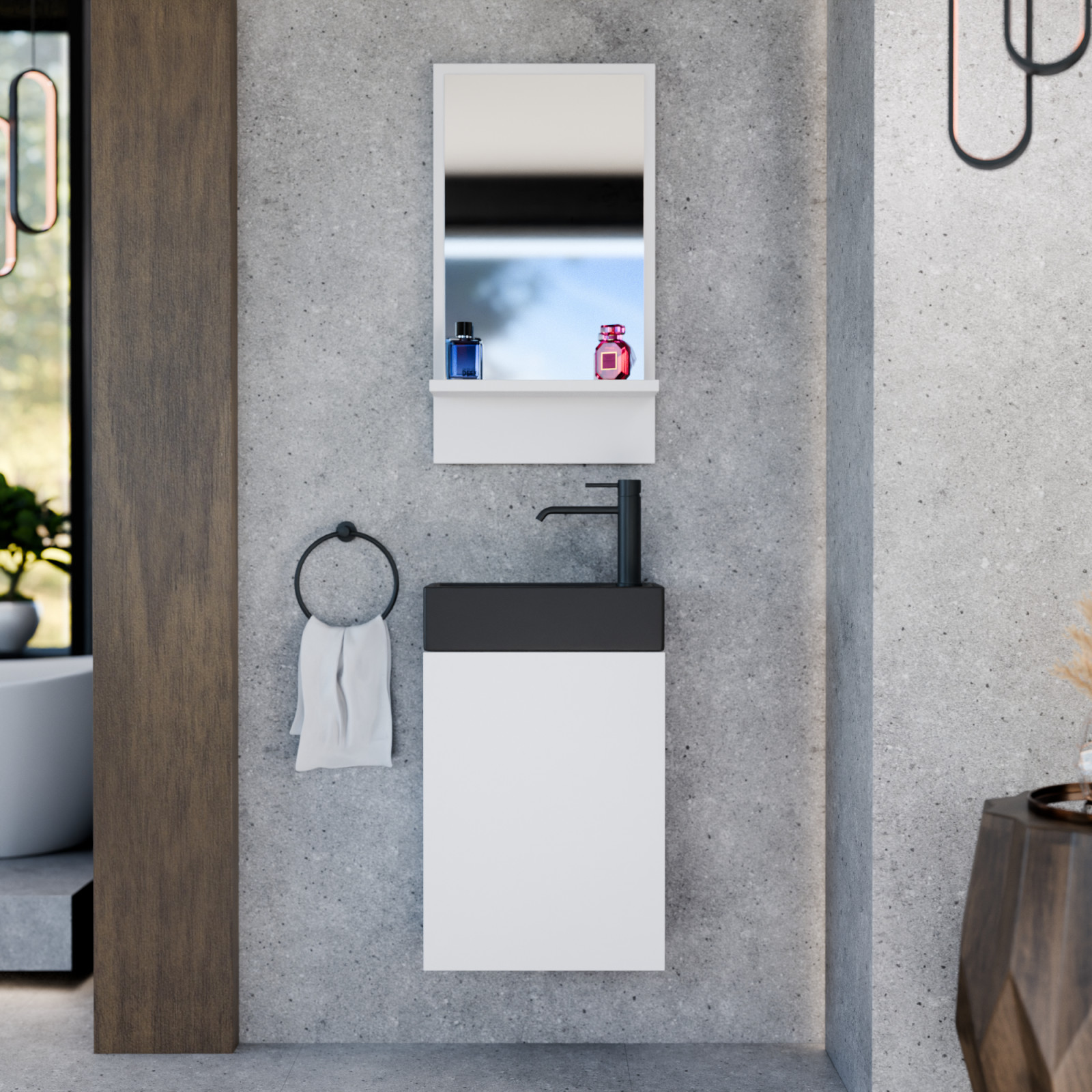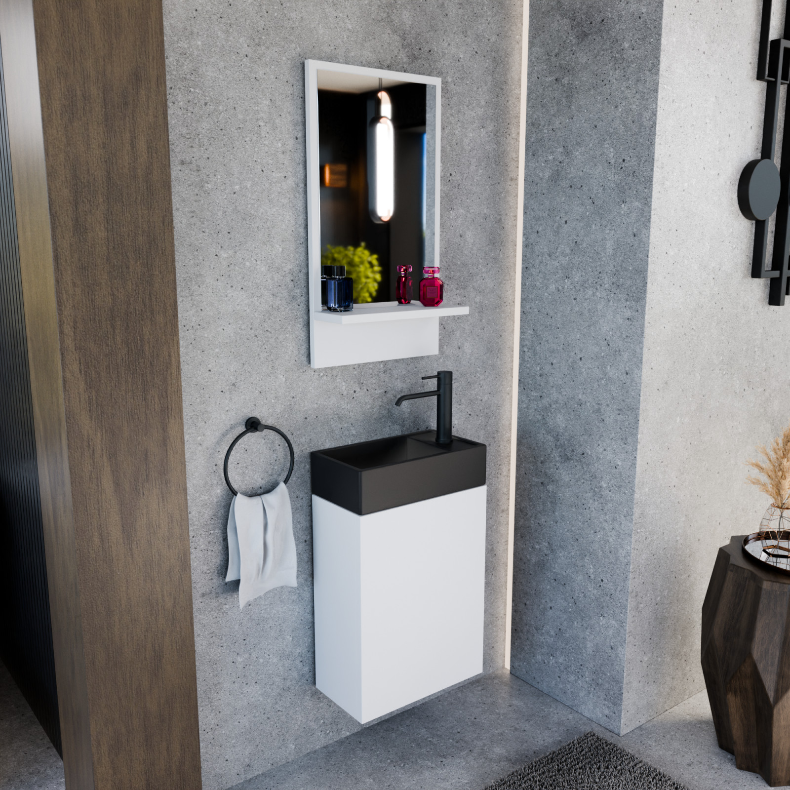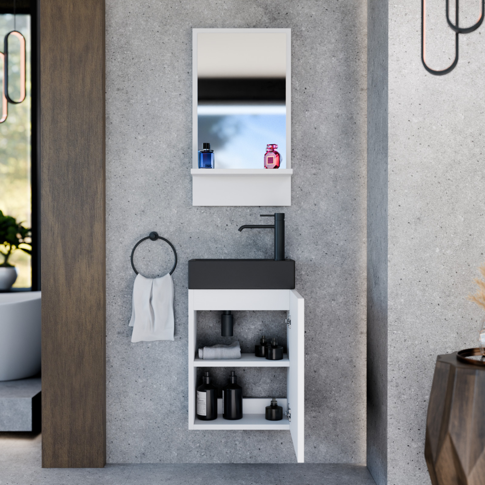 HD Lyon Matt White 40 fali mosdószekrény, matt fehér színben, matt fekete kerámia mosdóval és polcos tükörrel