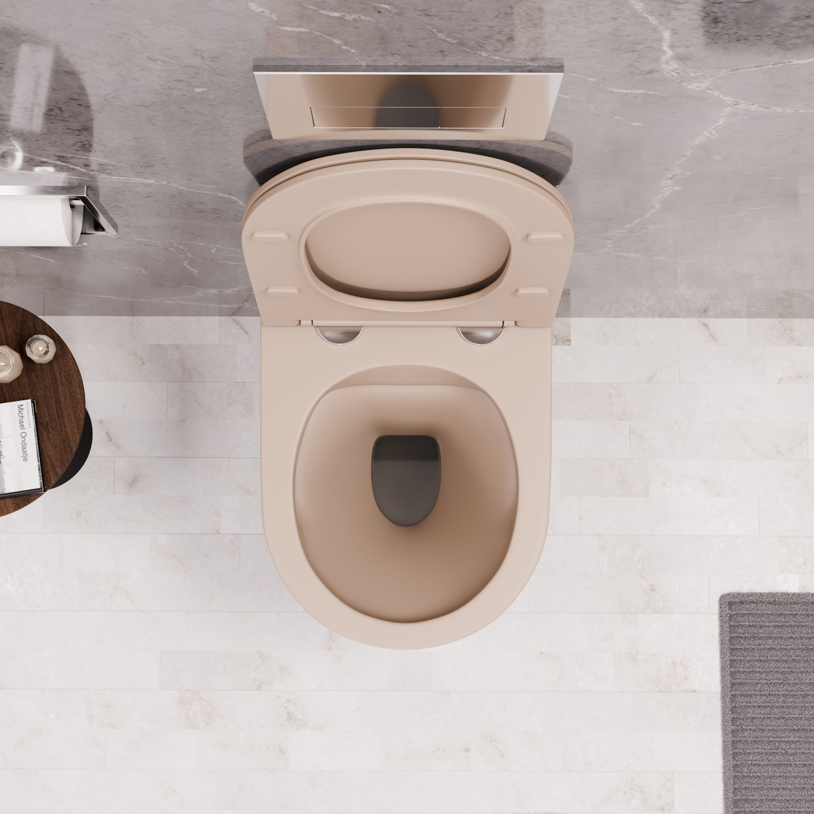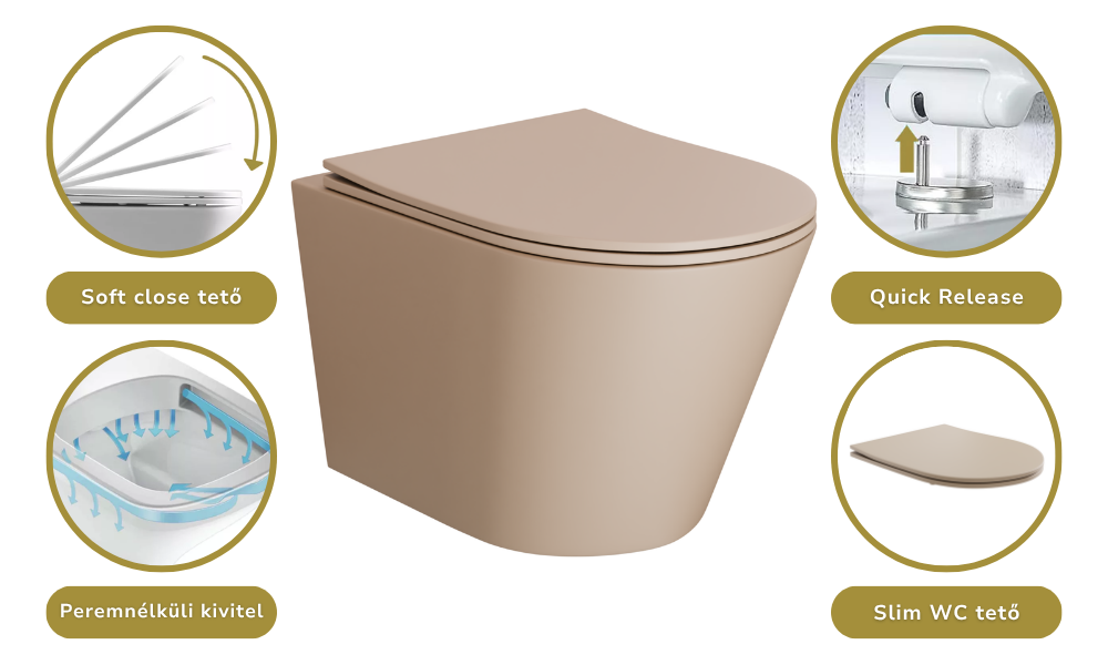 HD Madrid Matt Cappucino perem nélküli mély öblítésű íves fali WC slim "P" tetővel és fényes króm zsanérral