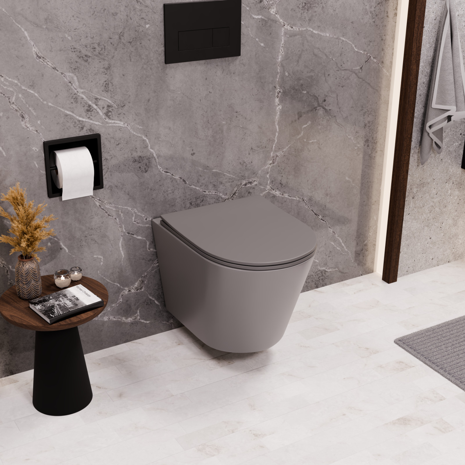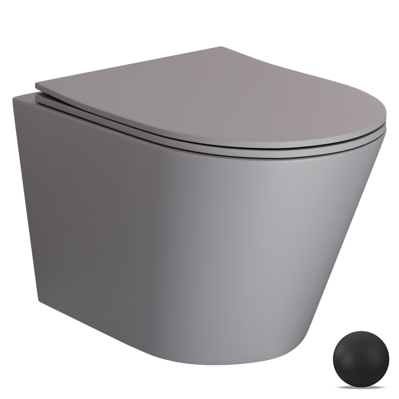 HD Madrid Matt Grey perem nélküli mély öblítésű íves fali WC slim "P" tetővel és matt fekete zsanérral